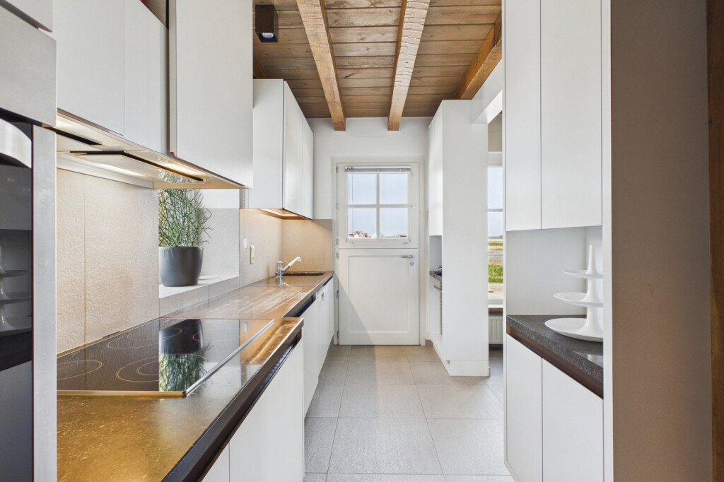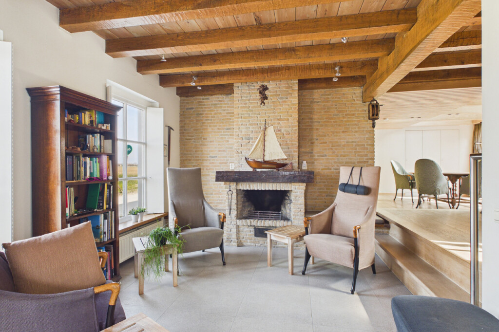 Bij binnenkomst betreed je direct de sfeervolle leefkeuken, het warme hart van de woning. Hier bevindt zich een schouw met open haard, een fraaie zitkamer met uitzicht over de landerijen en een complete inbouwkeuken voorzien van onder meer een afwasmachine, keramische kookplaat, afzuigkap, oven en koelkast. Vanuit de keuken is er toegang tot de kelder, de achteringang met praktische kastruimte en een modern toilet met zwevend closet en fonteintje.
