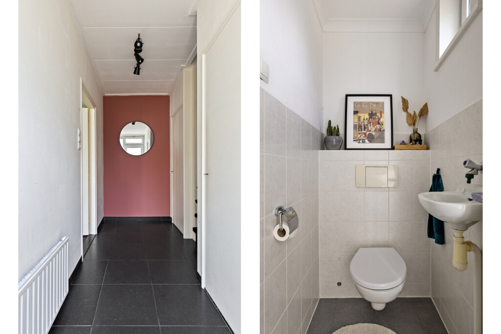 Het toilet is half betegeld en voorzien van een hangtoilet en fonteintje. Vanuit de hal is de woonkamer bereikbaar.