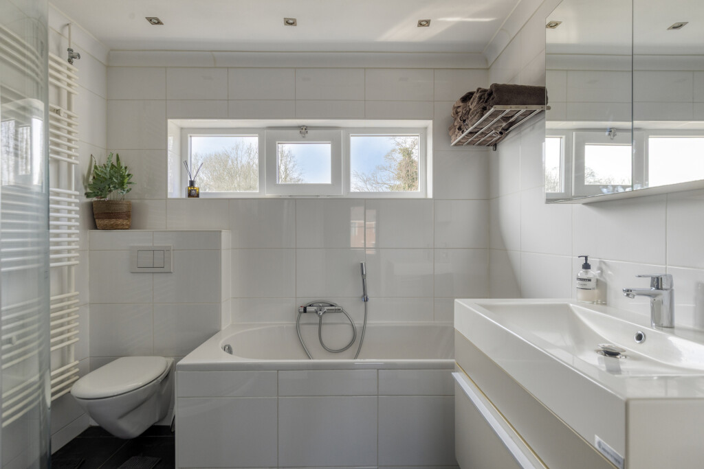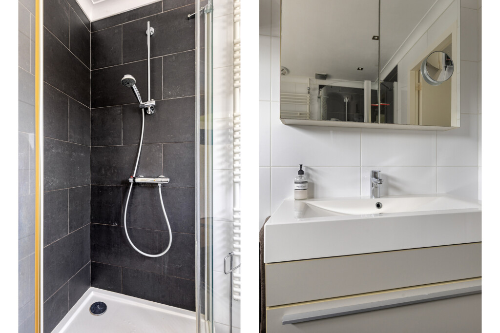 De badkamer (vernieuwd in 2008) is volledig betegeld en uitgerust met een douchecabine, ligbad, hangtoilet, wastafel met meubel, designradiator, inbouwspots en mechanische ventilatie.