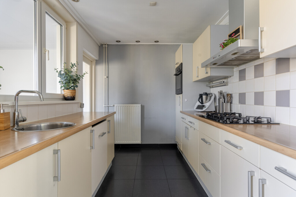 De doorzonwoonkamer beschikt over een fraaie parketvloer en een schouw. Het zitgedeelte bevindt zich aan de voorzijde en het eetgedeelte aan de achterzijde, direct grenzend aan de open keuken. De ramen zijn voorzien van screens, ideaal om de directe zoninstraling te beperken. De provisiekast is ideaal voor het opbergen van verschillende spullen.