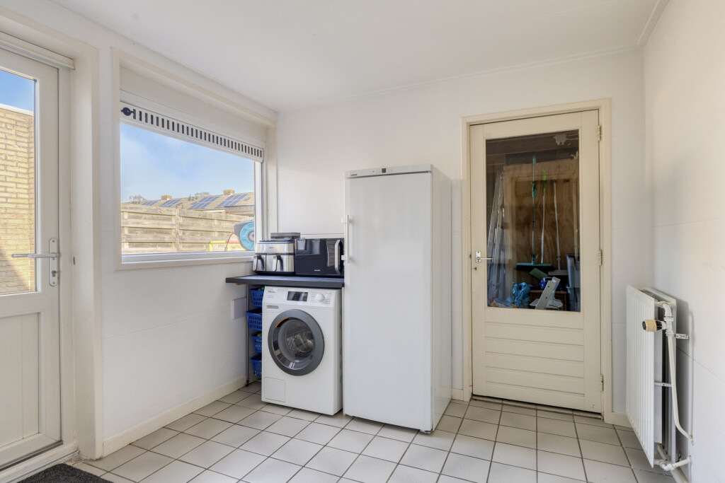 De bijkeuken is praktisch ingericht met een tegelvloer en aansluitingen voor wasapparatuur. Hier is tevens voldoende ruimte voor een extra koelkast of vriezer. Via de tuindeur bereikt u de achtertuin en via een tweede deur de garage.