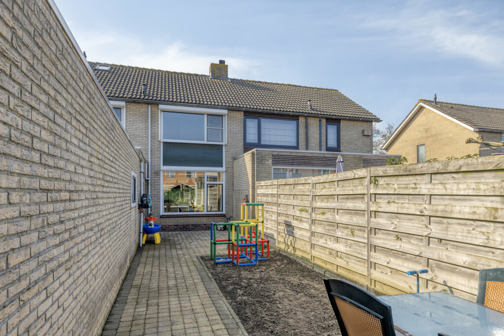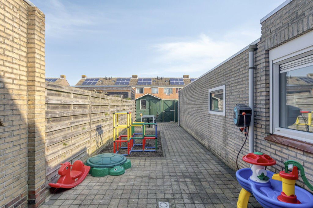 De achtertuin is gelegen op het noordoosten, grotendeels betegeld en onderhoudsvriendelijk aangelegd. Achterin de tuin staat een houten tuinhuis. Via de poort is de achterliggende straat bereikbaar.