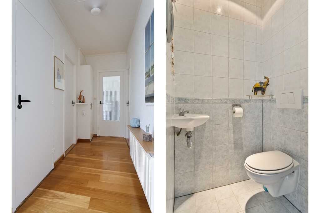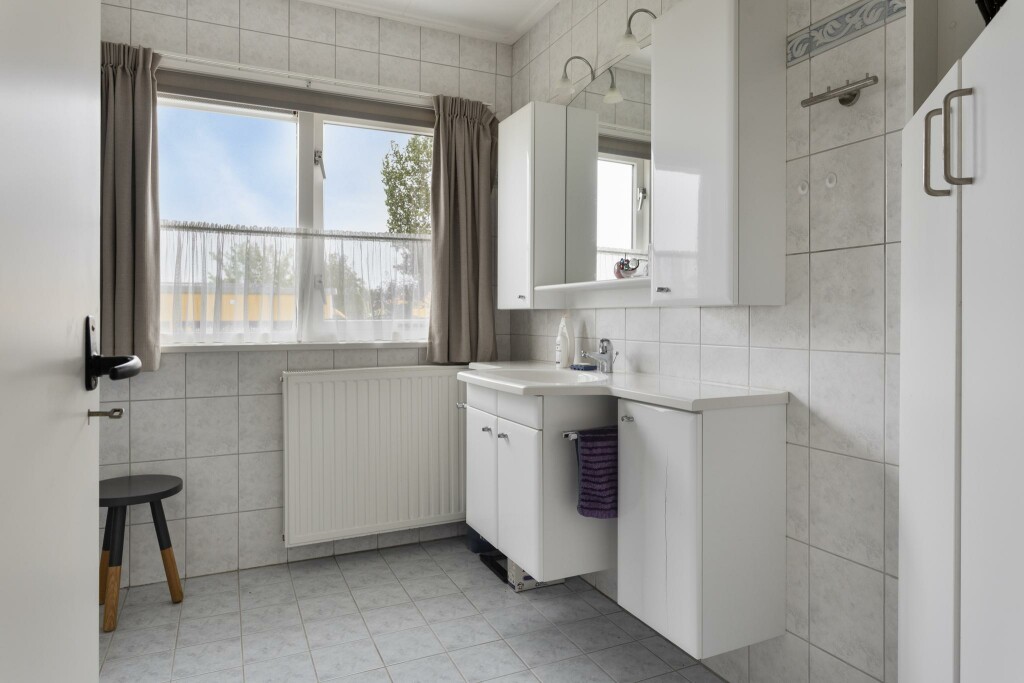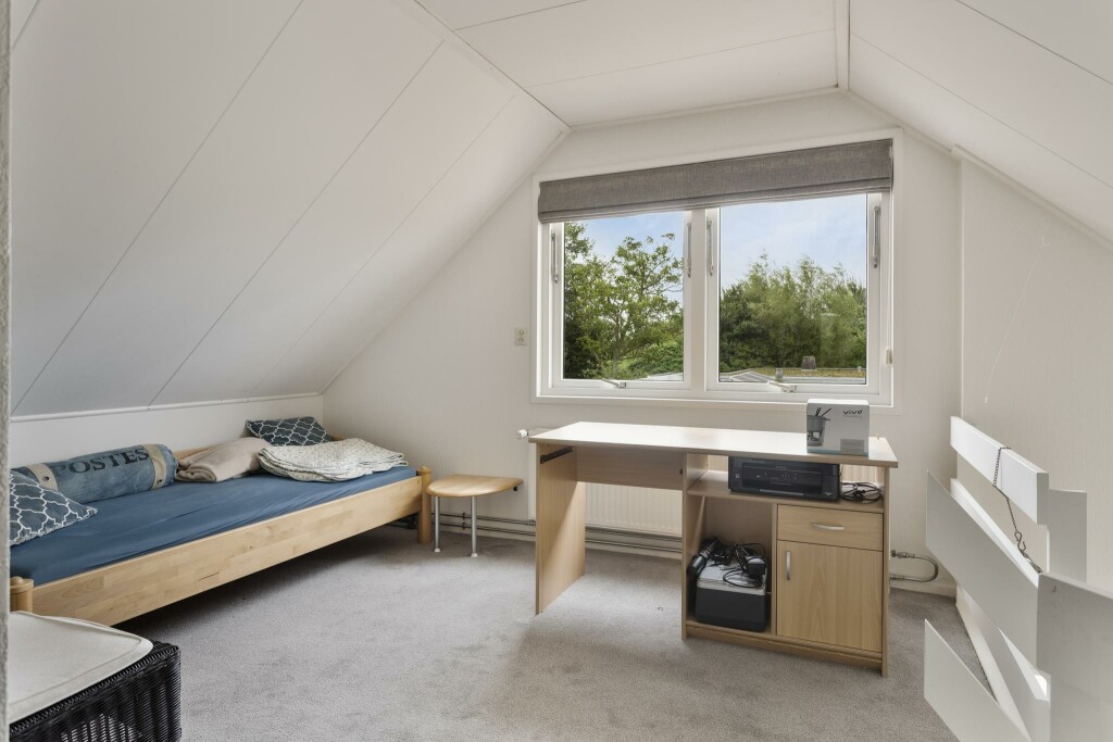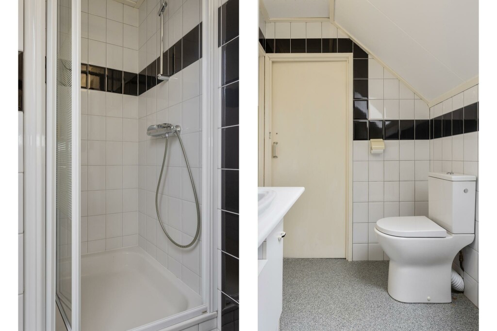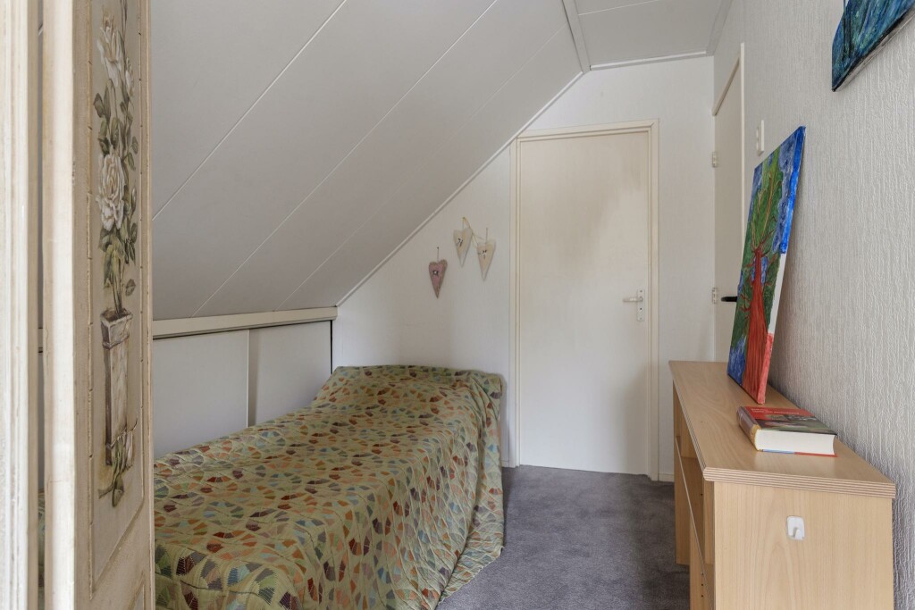 Op de eerste verdieping vindt u een ruime overloop met mogelijkheden voor extra slaapruimte, een royale slaapkamer en een badkamer met douche, wastafelmeubel en een tweede toilet. De badkamer is zowel bereikbaar via de overloop als de slaapkamer. Onder de schuine daken is extra bergruimte gecreëerd.