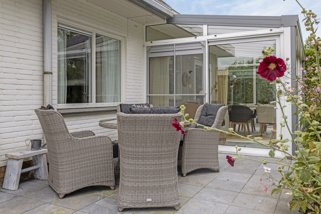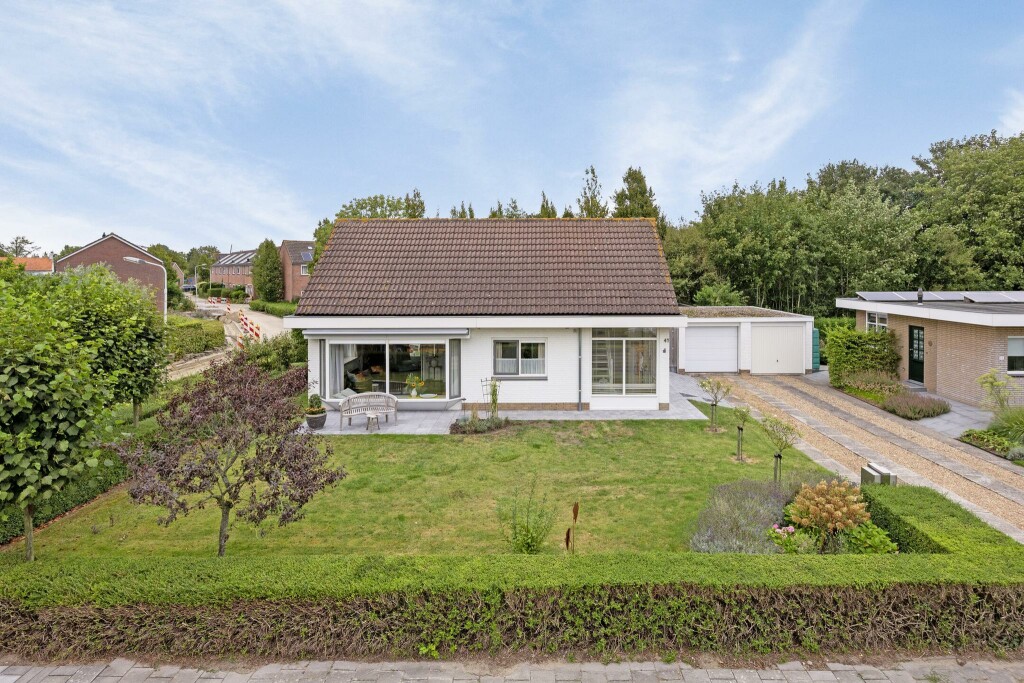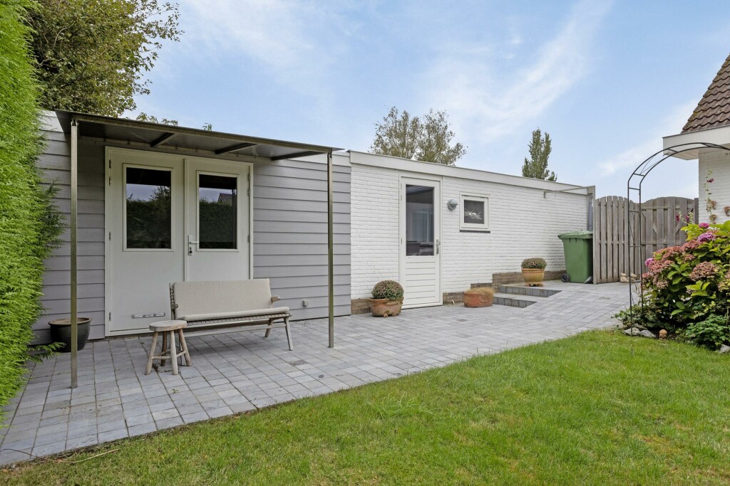 De achtertuin biedt veel privacy en aan de zijkant van de woning ligt de vrijstaande garage met elektrische roldeur en een berging met elektra, en een luifel. Aan de achterzijde van de woning is een elektrisch zonnescherm geïnstalleerd. De lange oprit biedt voldoende ruimte om meerdere auto\'s te parkeren.