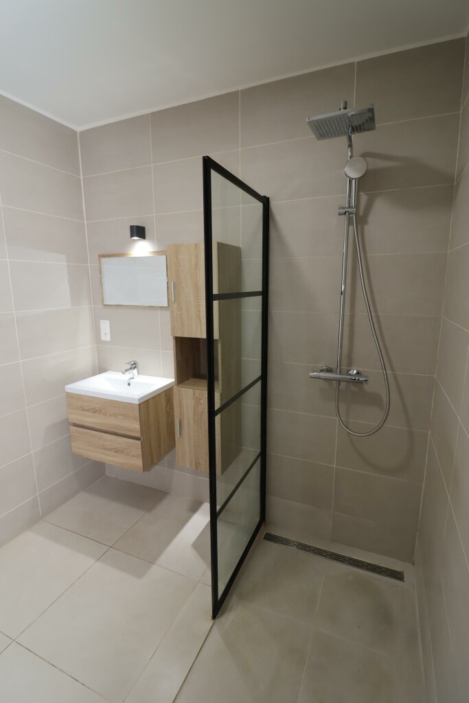 Overloop met toegang tot drie ruime slaapkamers. De centraal gelegen badkamer is modern afgewerkt en voorzien van een inloopdouche en een wastafel met meubel. Het tegelwerk loopt door tot aan het plafond.