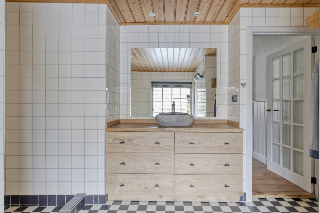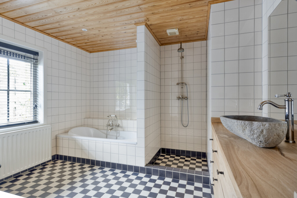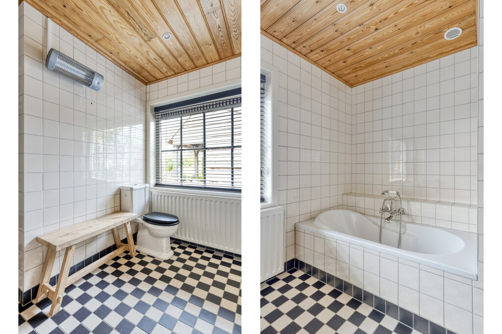 De badkamer is geheel betegeld en voorzien van inbouwspots, elektrische kachel, inloopdouche, ligbad, toilet en wastafel met meubel.