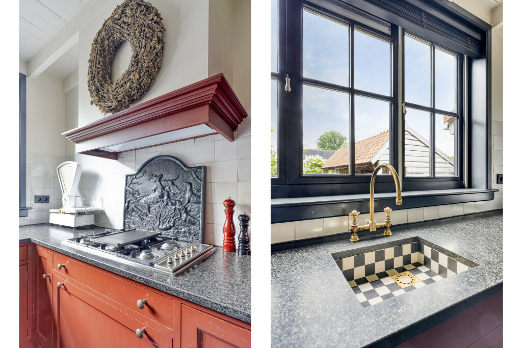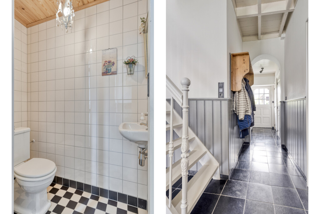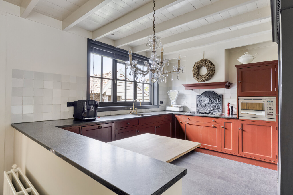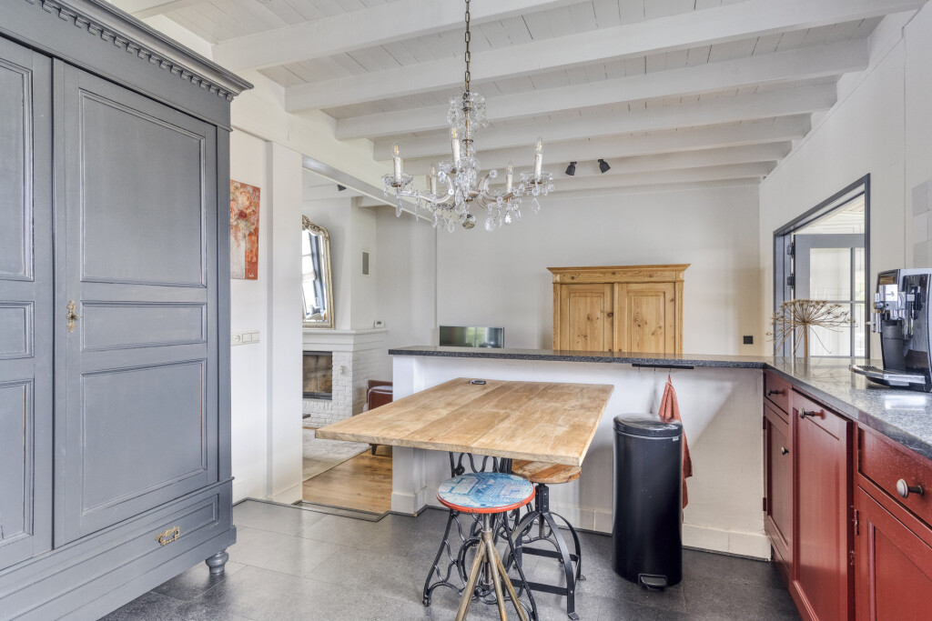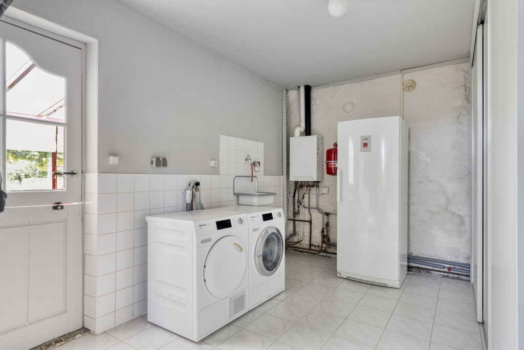Bijkeuken is half betegeld en voorzien van c.v.-ketel, aansluiting voor de wasapparatuur en er is voldoende plaats voor het stallen van een extra koelkast of vriezer. In de vaste kastenwand is er volop bergruimte.