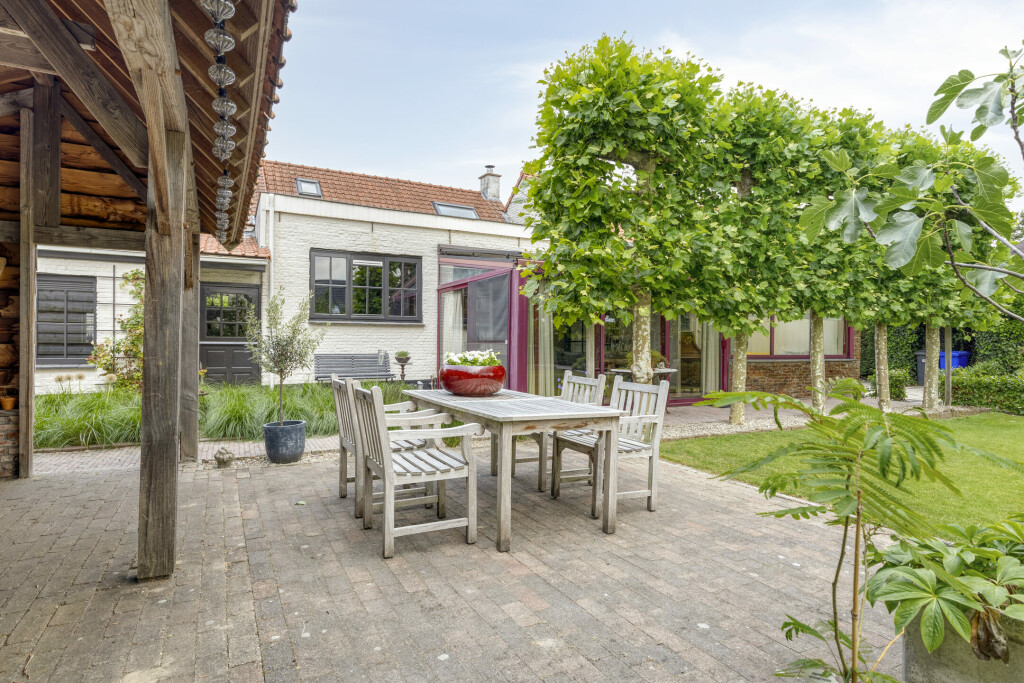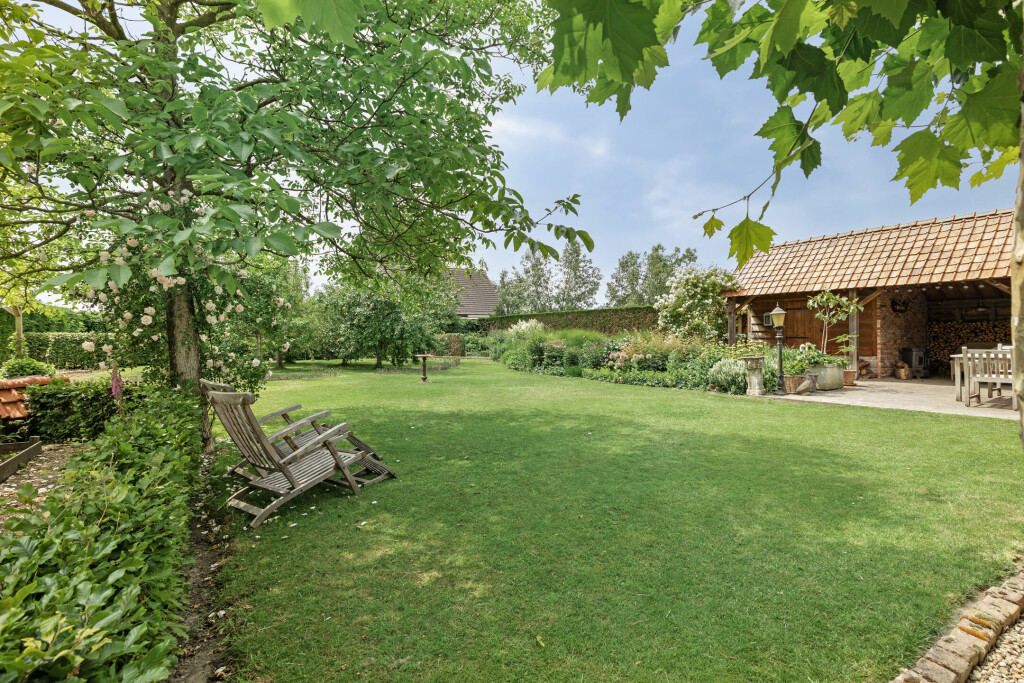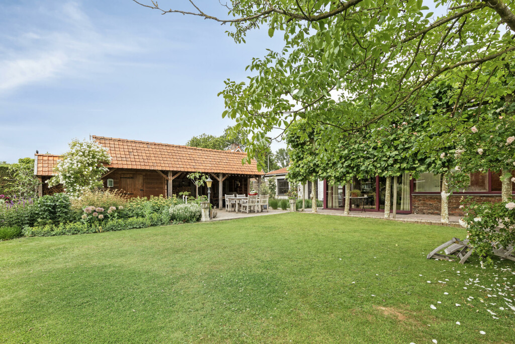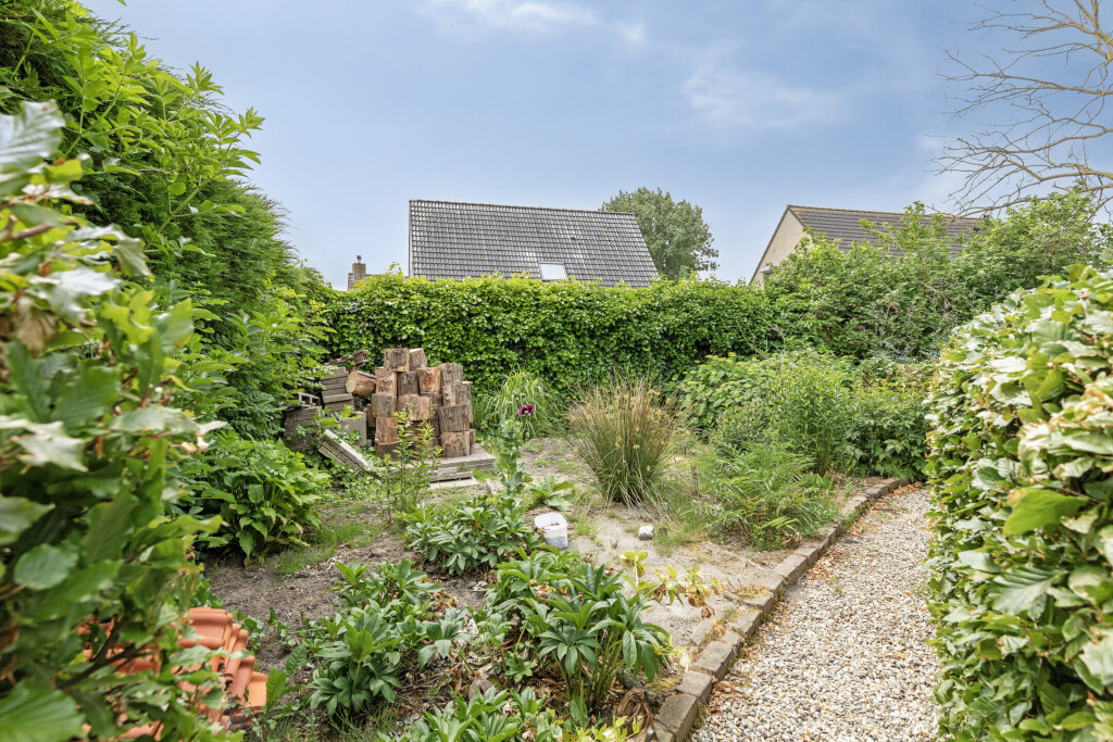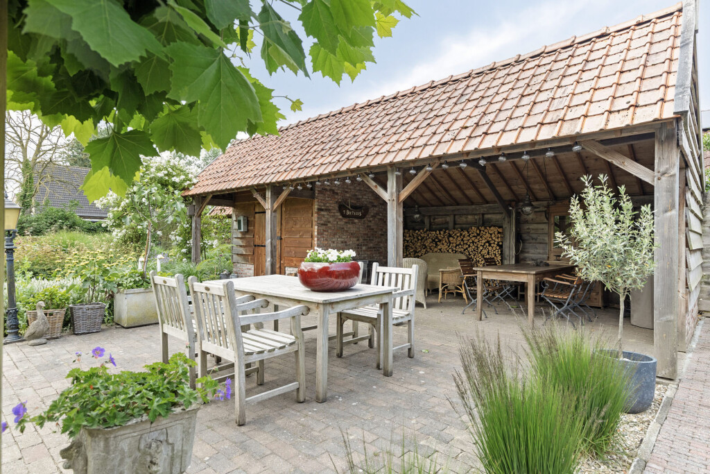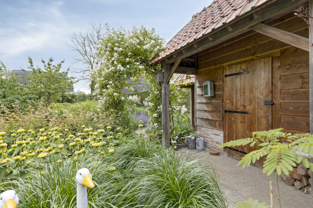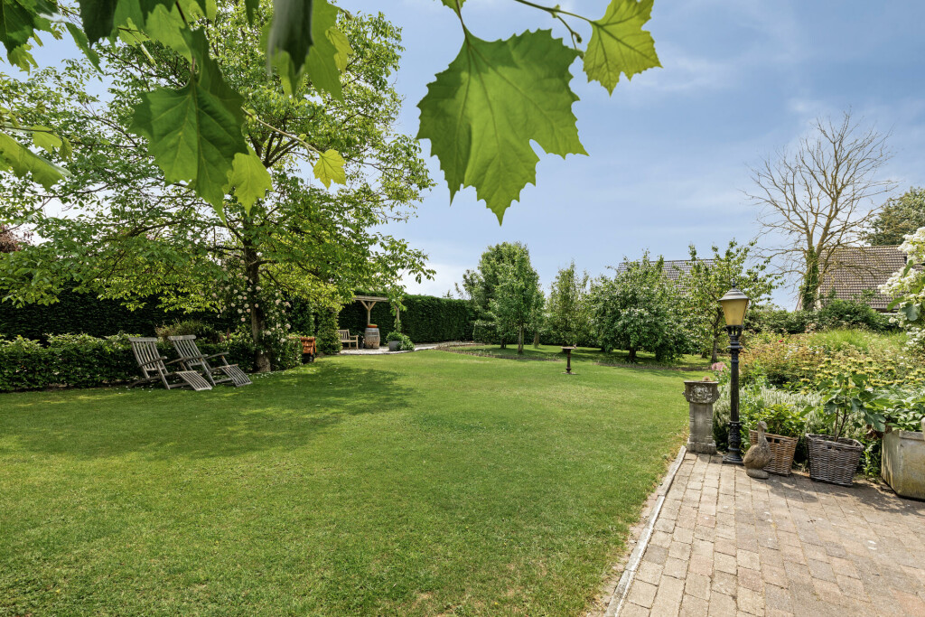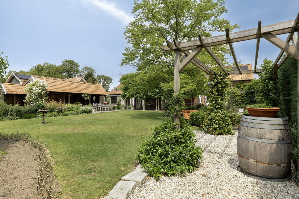 De fraai aangelegde en verzorgde achtertuin is gelegen op het zuidwesten en beschikt over diverse terrassen, bordes met sierbeplanting, gazon, fruitbomen en aan de zijkant van de tuin een ruime overkapping met aangrenzende berging en overdekte houtopslag. Tevens is er een oude regenbak en kunt u de besproeiing van de beplantingzelf voorzien. U kunt vanuit meerdere posities genieten van uw tuin, in de zon maar ook in de schaduw. Via een tuinhek is de voorzijde van de straat bereikbaar.