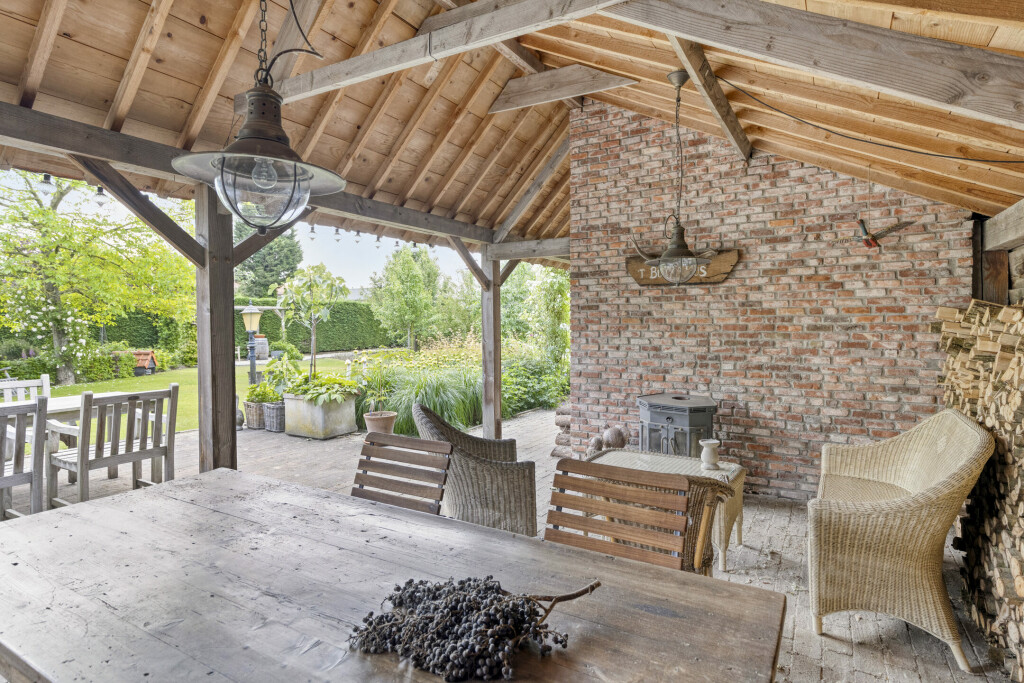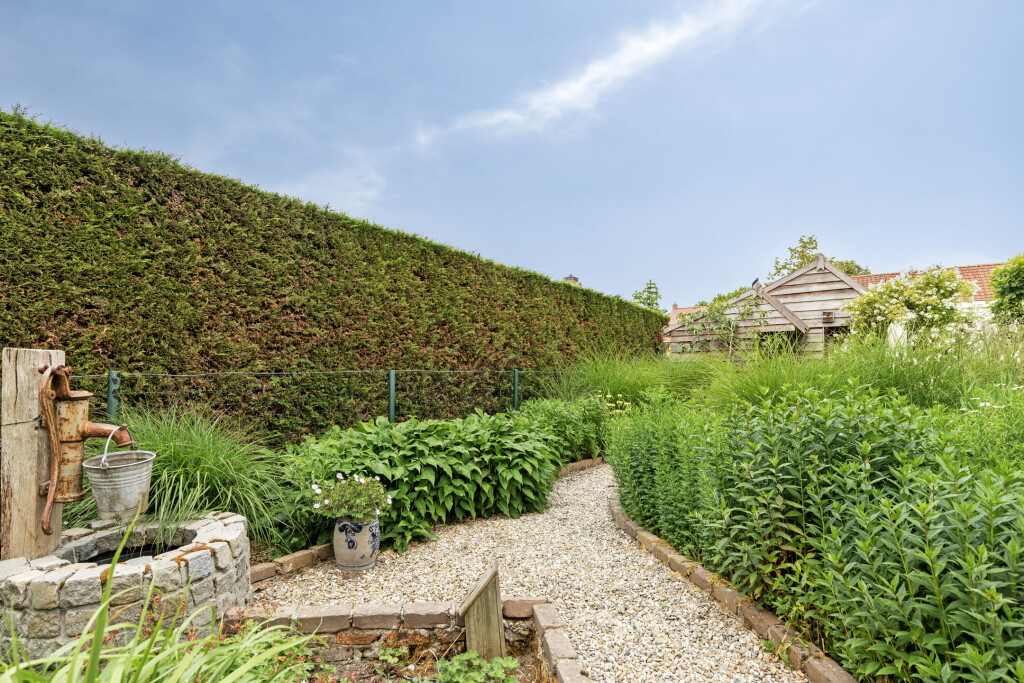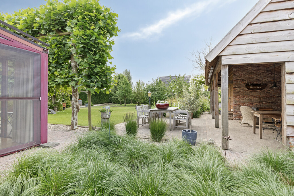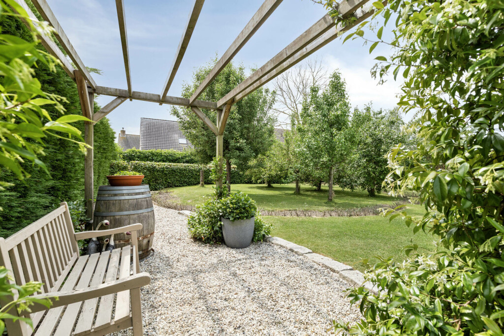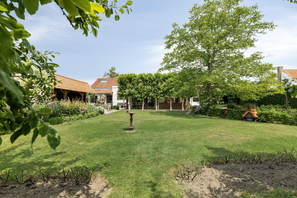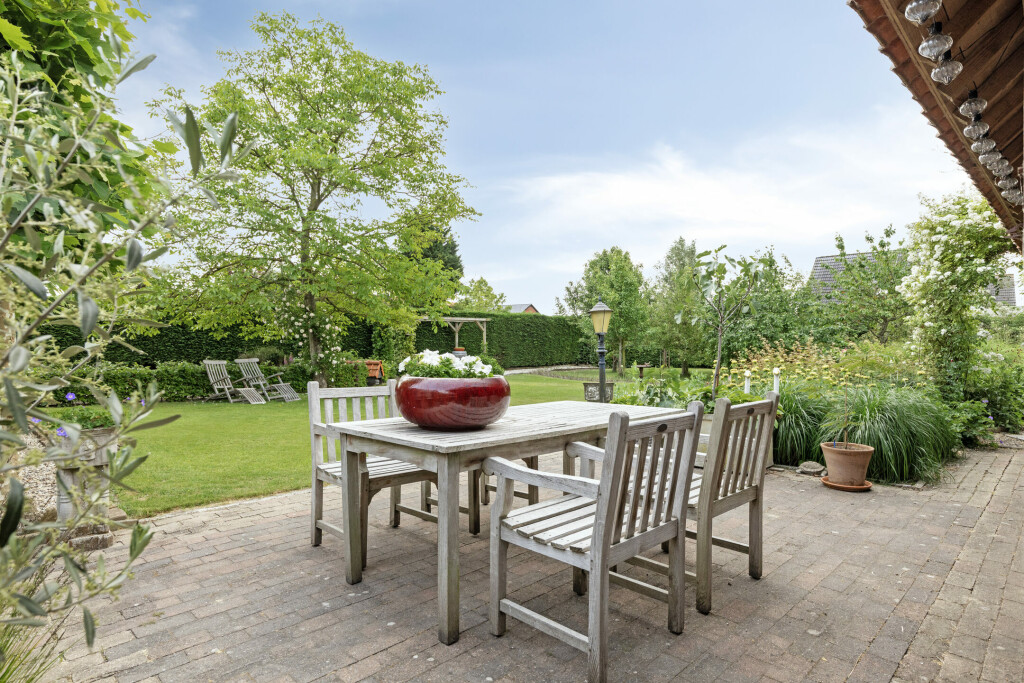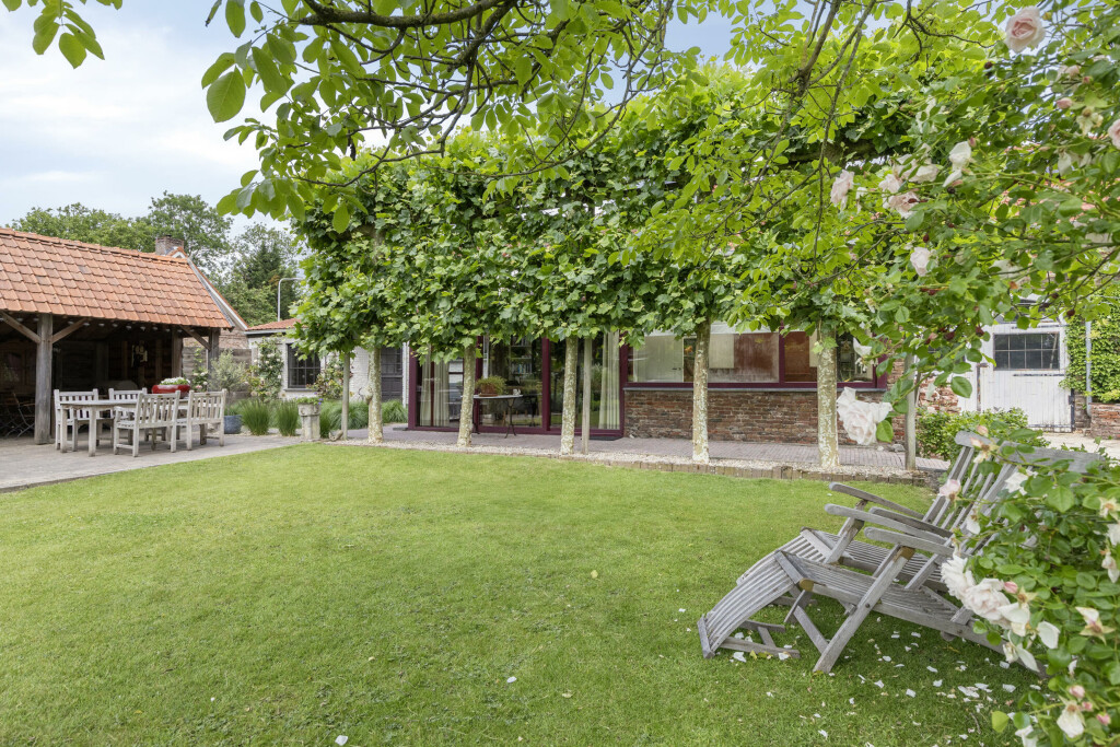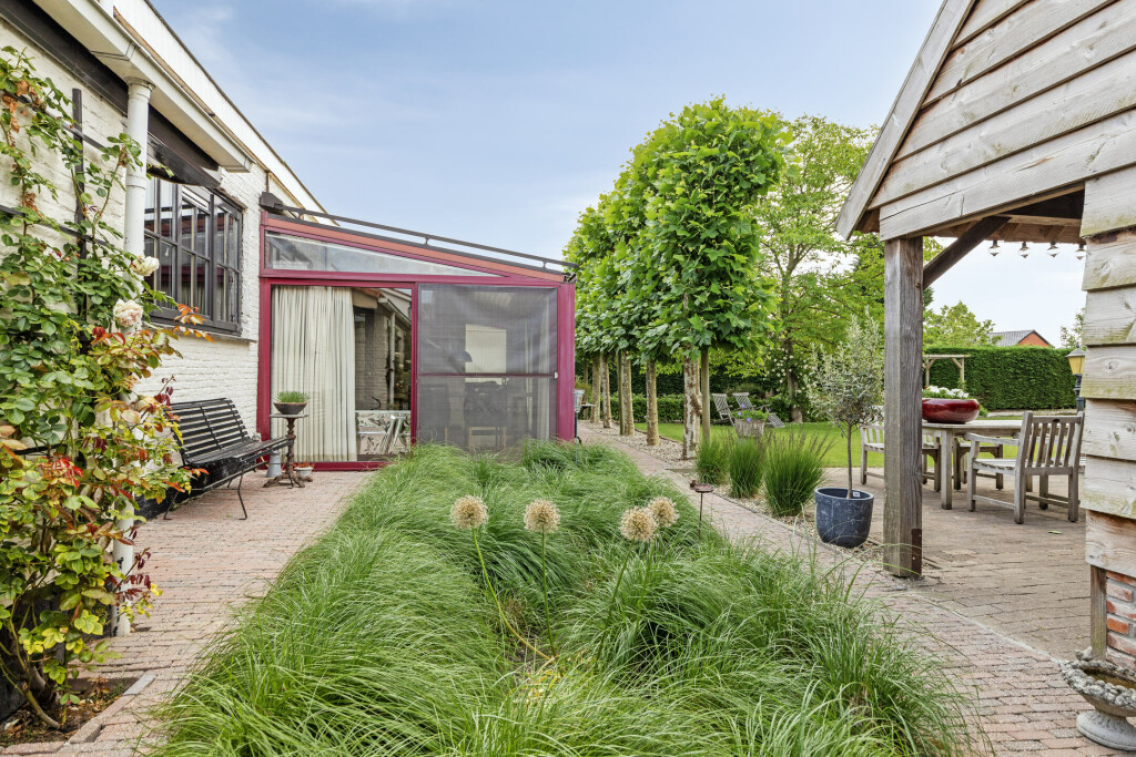 De fraai aangelegde en verzorgde achtertuin is gelegen op het zuidwesten en beschikt over diverse terrassen, bordes met sierbeplanting, gazon, fruitbomen en aan de zijkant van de tuin een ruime overkapping met aangrenzende berging en overdekte houtopslag. Tevens is er een oude regenbak en kunt u de besproeiing van de beplantingzelf voorzien. U kunt vanuit meerdere posities genieten van uw tuin, in de zon maar ook in de schaduw. Via een tuinhek is de voorzijde van de straat bereikbaar.