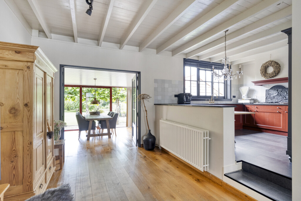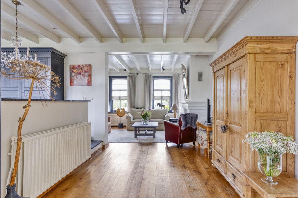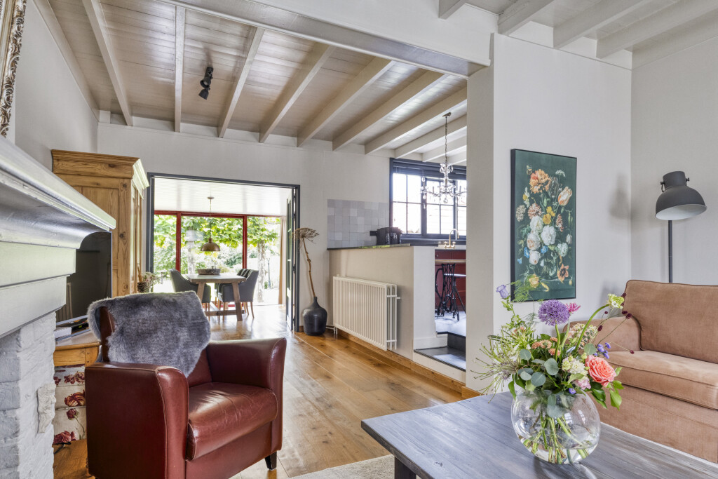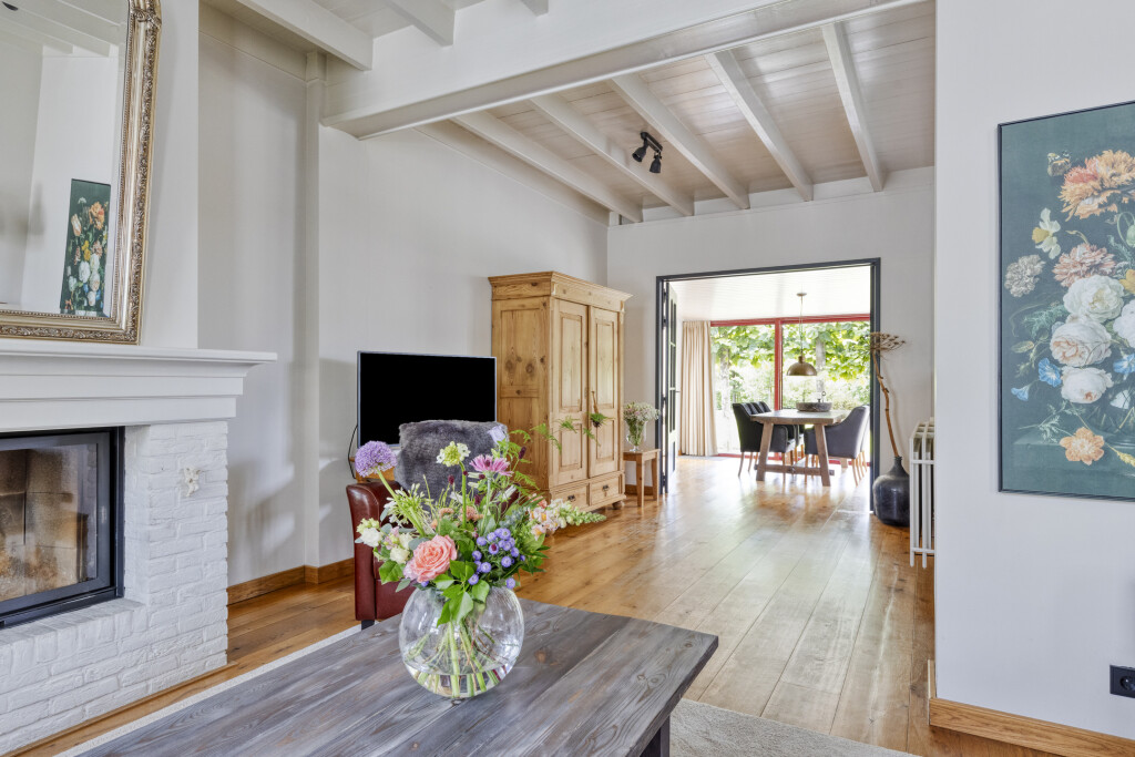 De woonkamer is voorzien van een massieve parketvloer en is aan de achterzijde uitgebouwd waardoor er extra woonruimte is gecreëerd. De schouw met sfeervolle houtkachel maakt het op koude winterdagen heerlijk behaaglijk. Aan de voorzijde van de woning is het zitgedeelte gesitueerd.