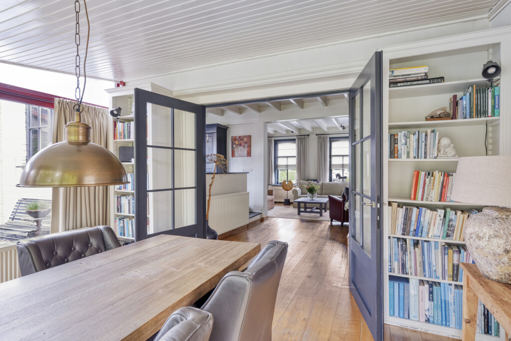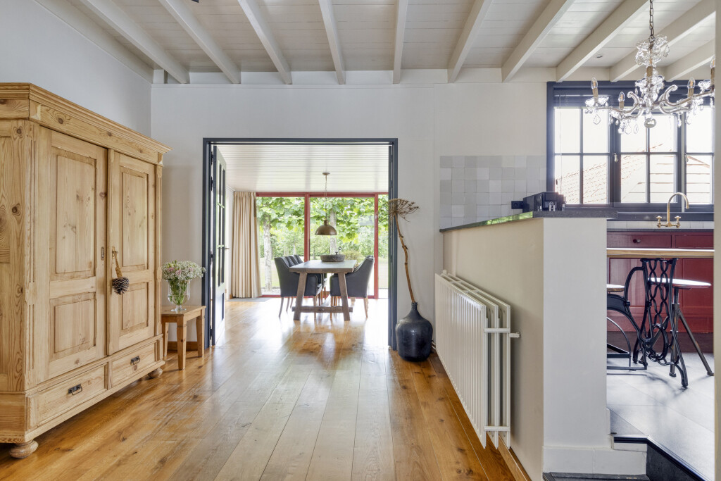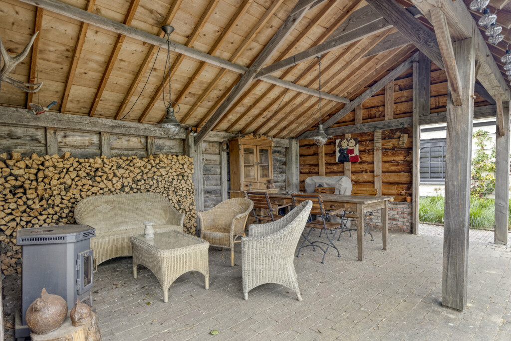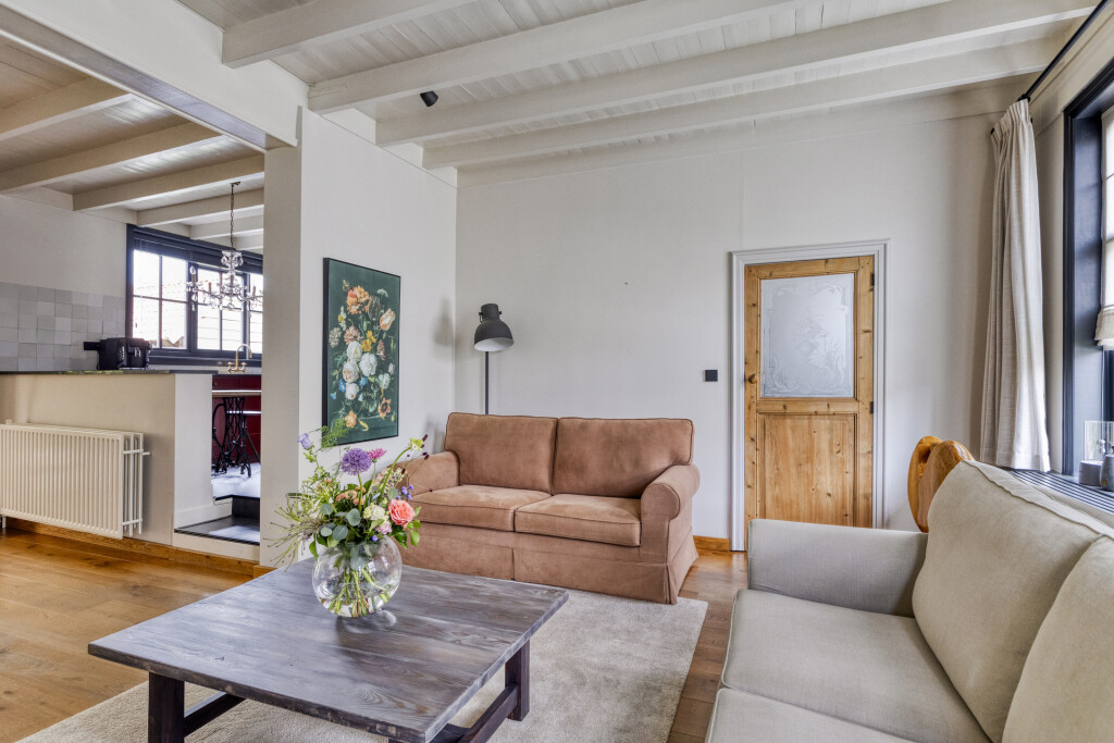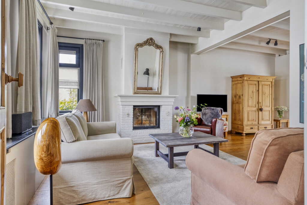 De woonkamer is voorzien van een massieve parketvloer en is aan de achterzijde uitgebouwd waardoor er extra woonruimte is gecreëerd. De schouw met sfeervolle houtkachel maakt het op koude winterdagen heerlijk behaaglijk. Aan de voorzijde van de woning is het zitgedeelte gesitueerd.