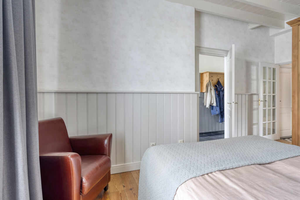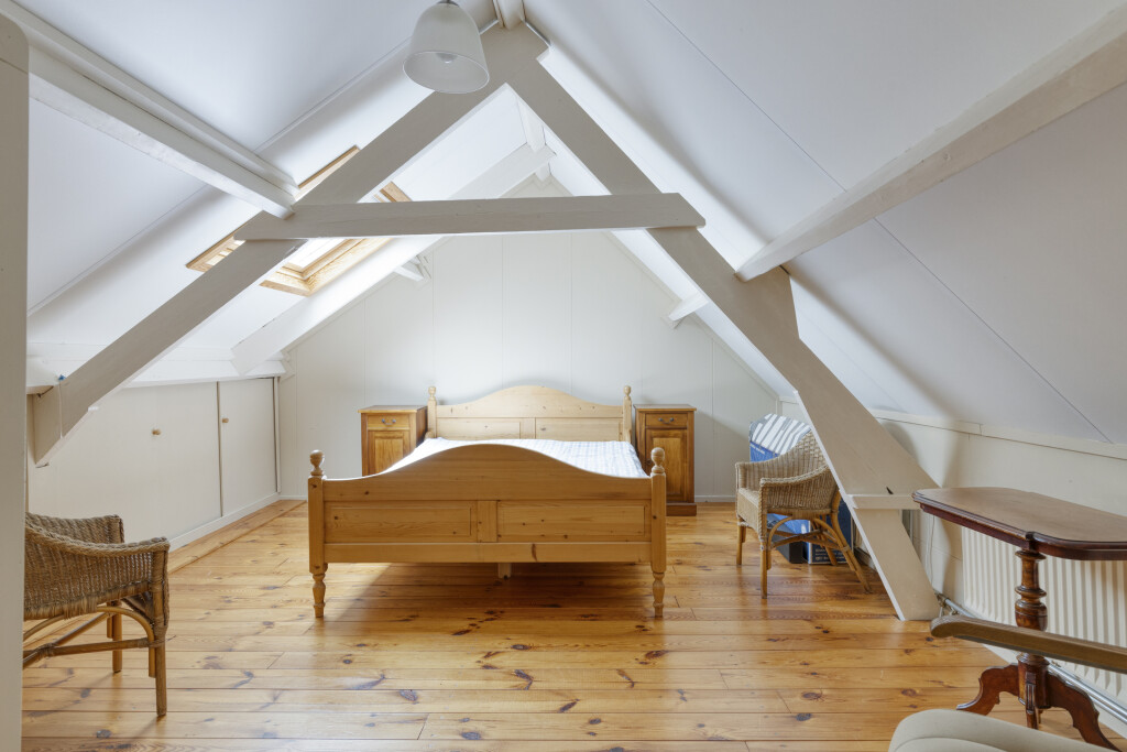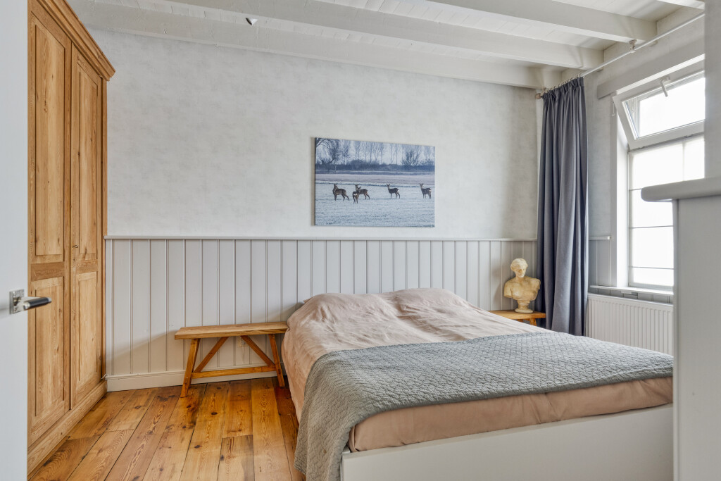De slaapkamer is gelegen aan de voorzijde van de woning en is ruim van formaat (16.5 m2) en voorzien van een massief houten parketvloer. Aansluitend is de badkamer bereikbaar.