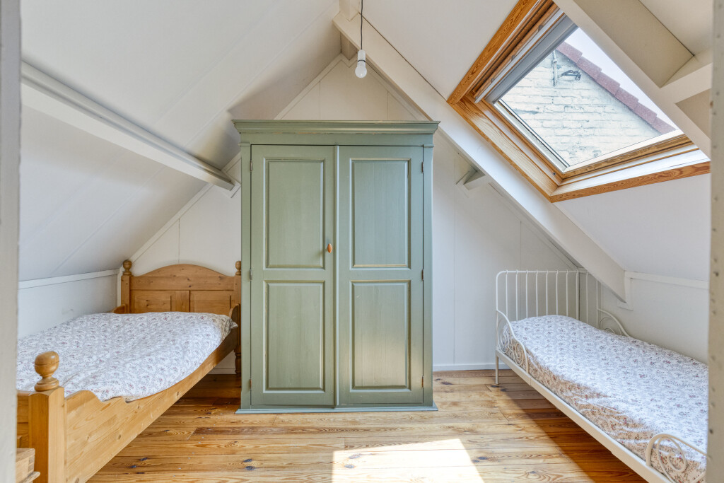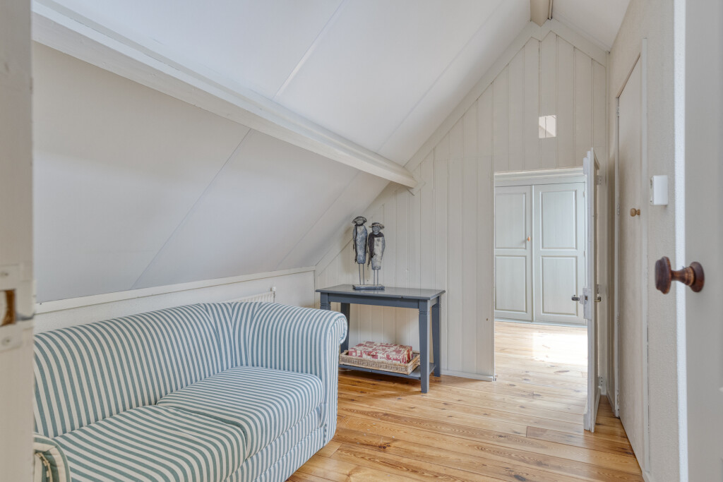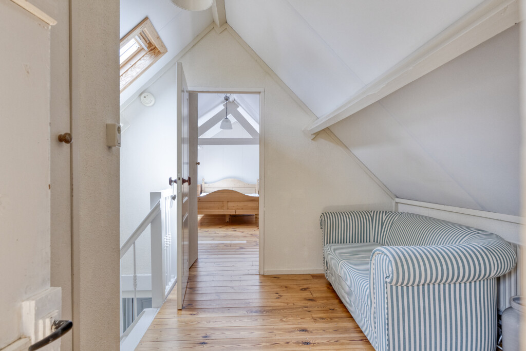 Op de eerste verdieping bevinden zich de overloop en 2 slaapkamers. De vloer is voorzien van houten parketvloer en de ruimtes beschikken allen over een dakraam. Achter de knieschotten is nog ruimte voor het opbergen van niet alledaagse spullen.
