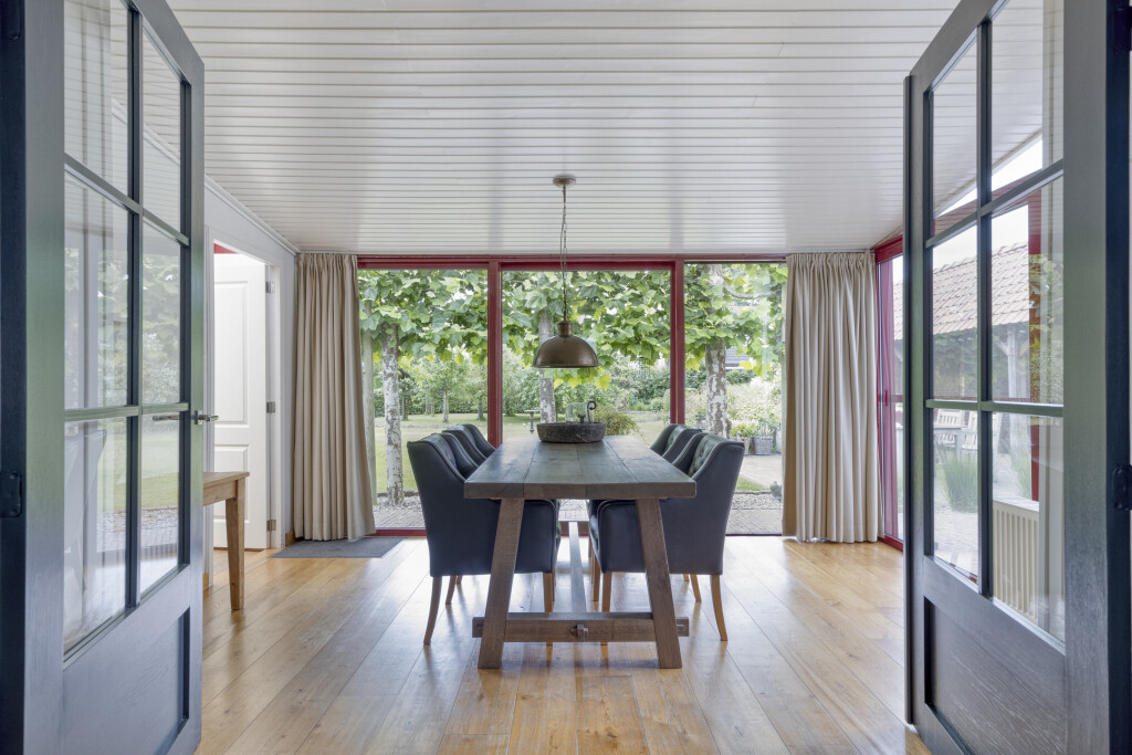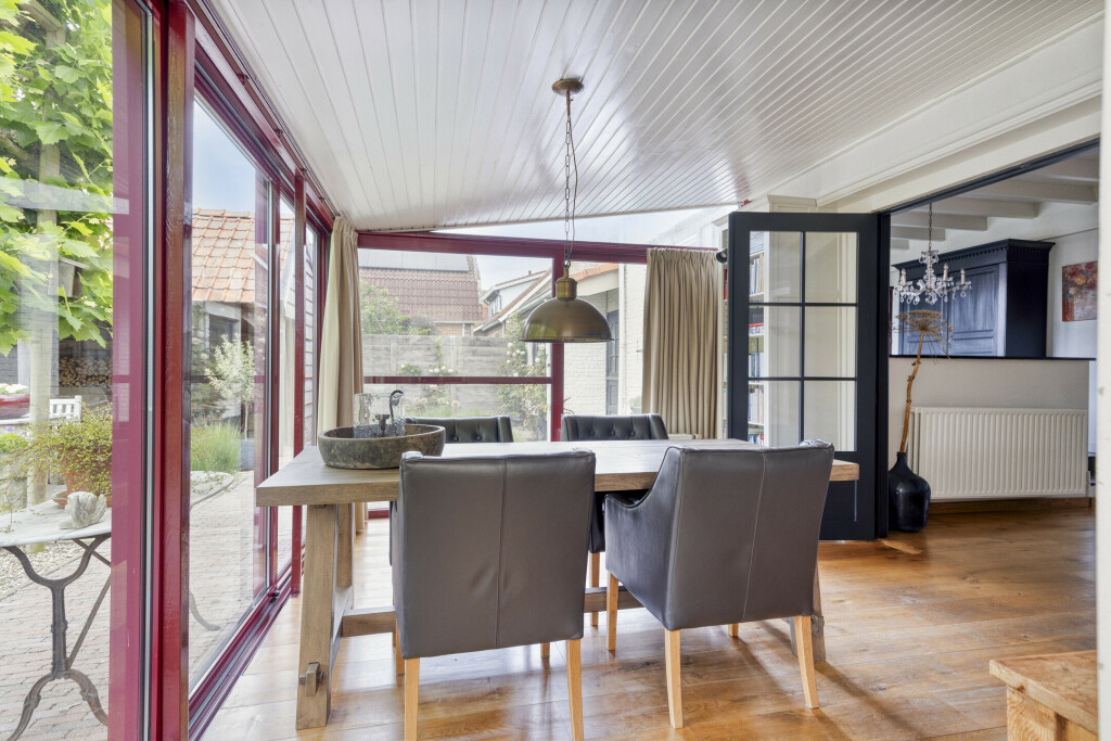 Via openslaande deuren is de serre bereikbaar, welke in 2 aparte ruimtes is opgedeeld. Het eerste gedeelte is aansluitend aan de woonkamer waar het eetgedeelte is voorzien. De parketvloer is doorgelegd, zodat het een mooi geheel vormt met de rest van de woonkamer. De serre is voorzien van zonwering en 2 schuifpuien, zodat direct contact ontstaan met de achtertuin.