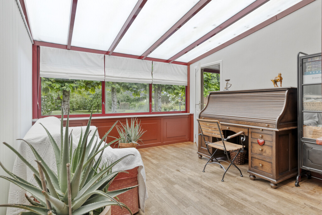 Het tweede gedeelte van de serre is voorzien van een massieve parketvloer en kan ingericht worden als werk- of hobbykamer.