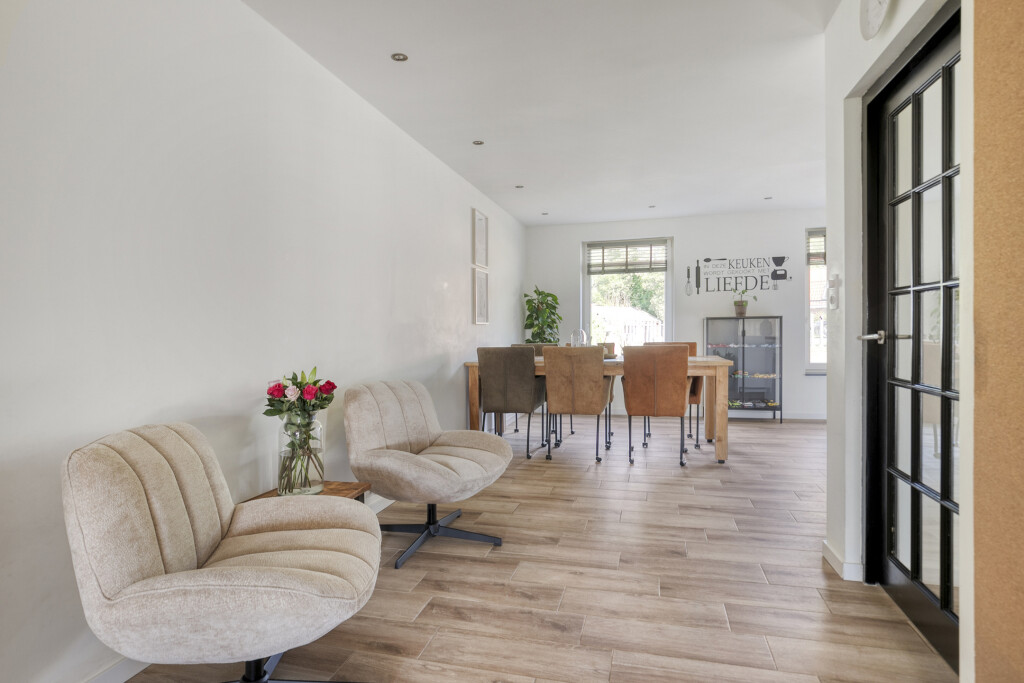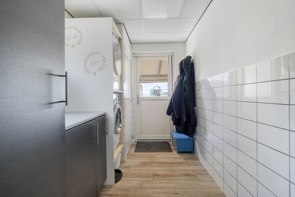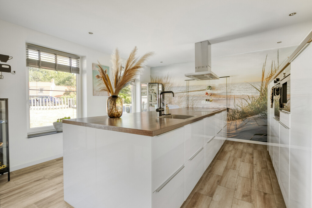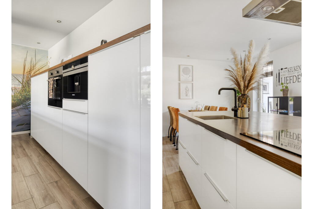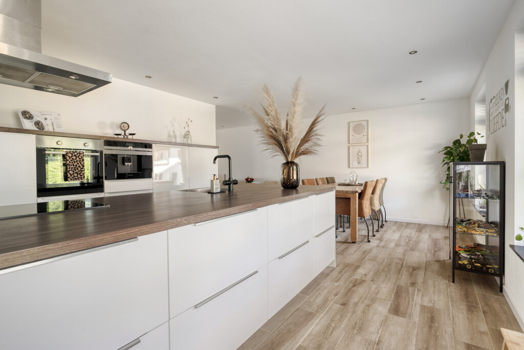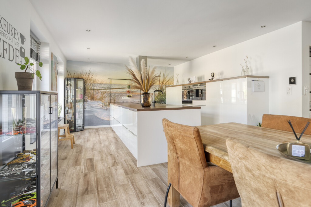 Bij binnenkomst betreedt u een ruime hal met toegang tot het moderne toilet en de praktische bijkeuken. Vanuit de hal komt u in de royale, lichte woonkamer met een open keuken. De keuken is uitgerust met een stijlvol kookeiland en moderne inbouwapparatuur, waaronder een inductiekookplaat uit 2024, afzuigkap, oven, koelkast, diepvries, vaatwasser, Quooker (2024) en een geïntegreerde koffiezetapparaat (2024). De openslaande deuren in de woonkamer geven direct toegang tot de zonnige achtertuin. De gehele begane grond is voorzien van comfortabele vloerverwarming.