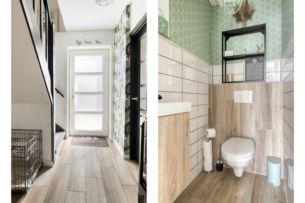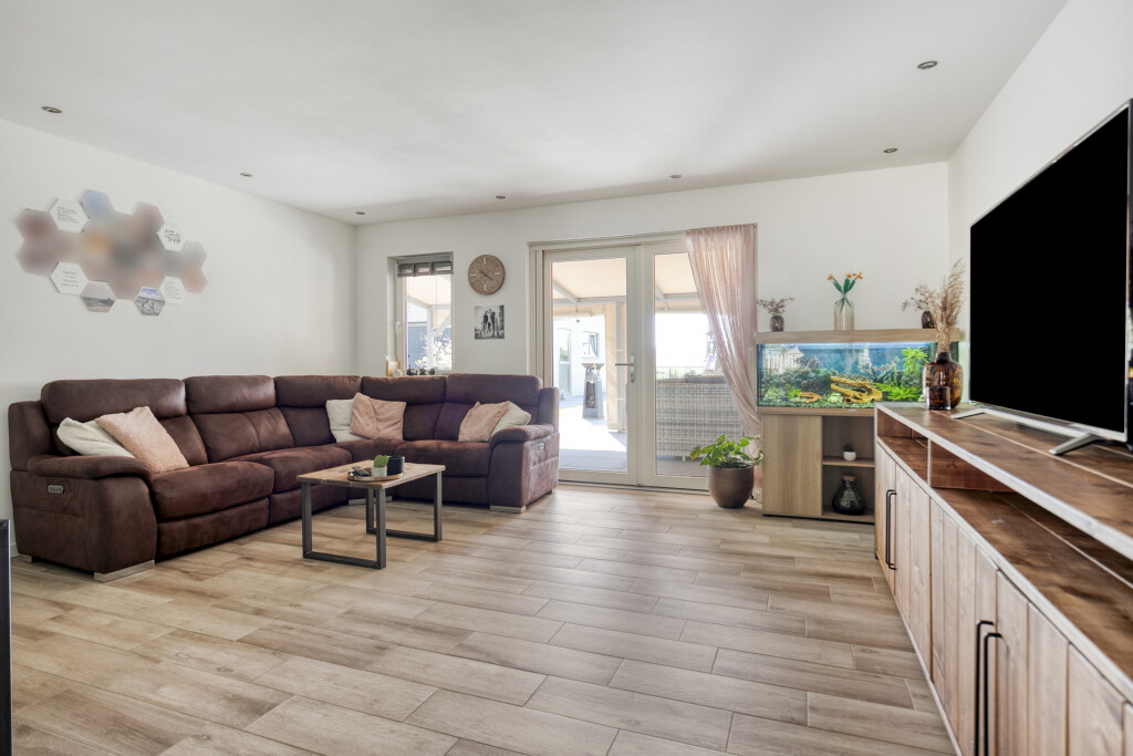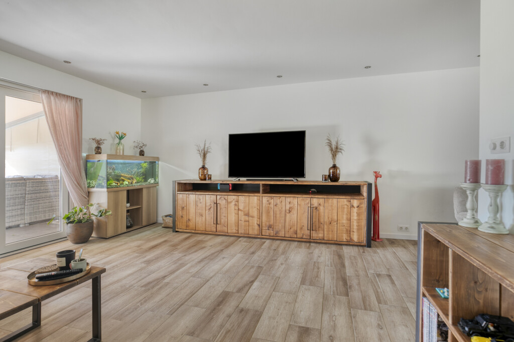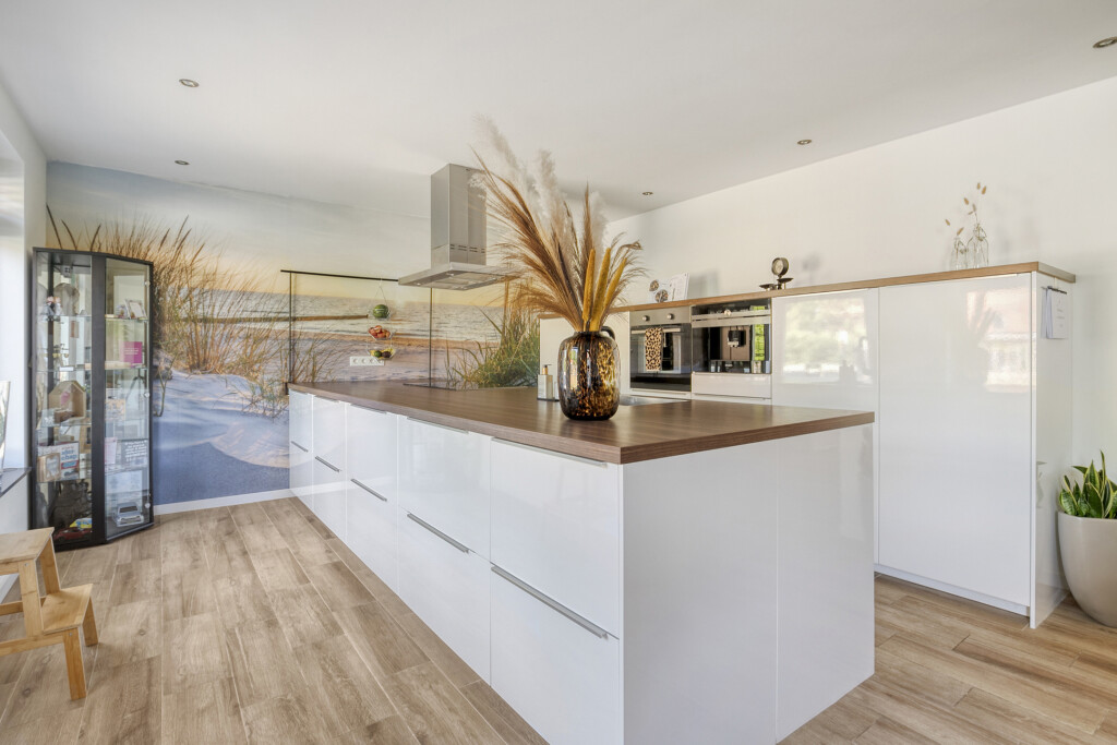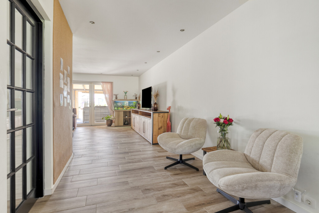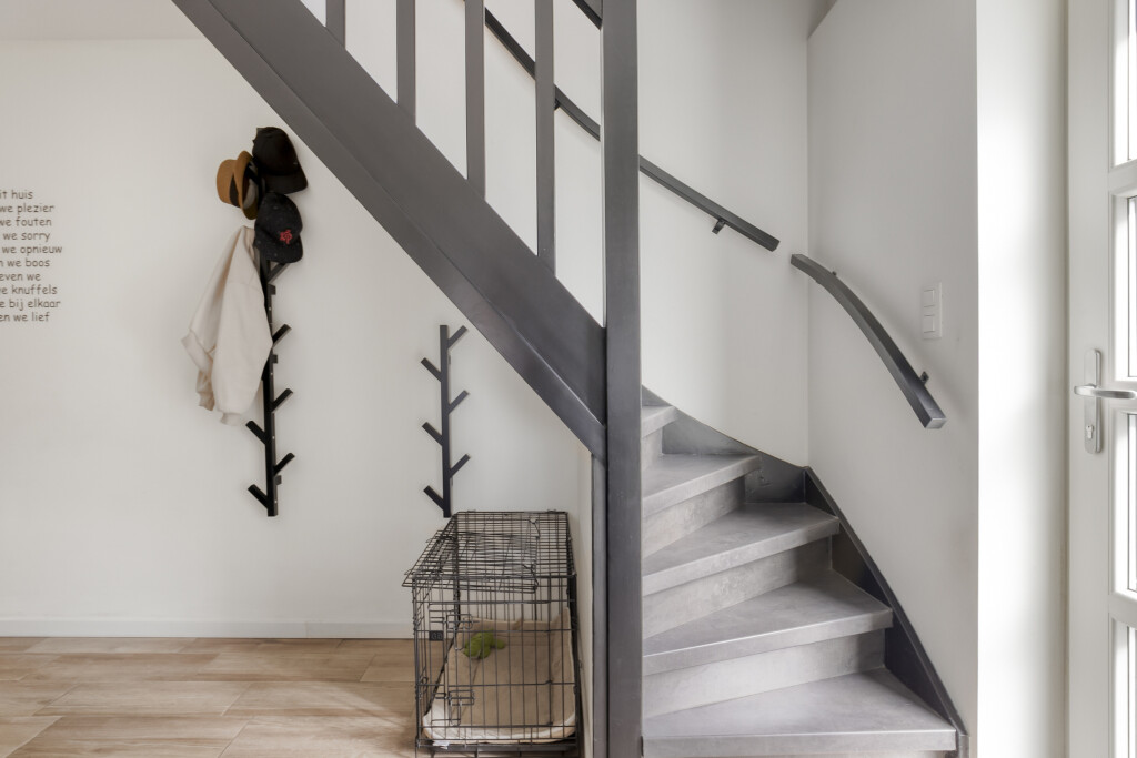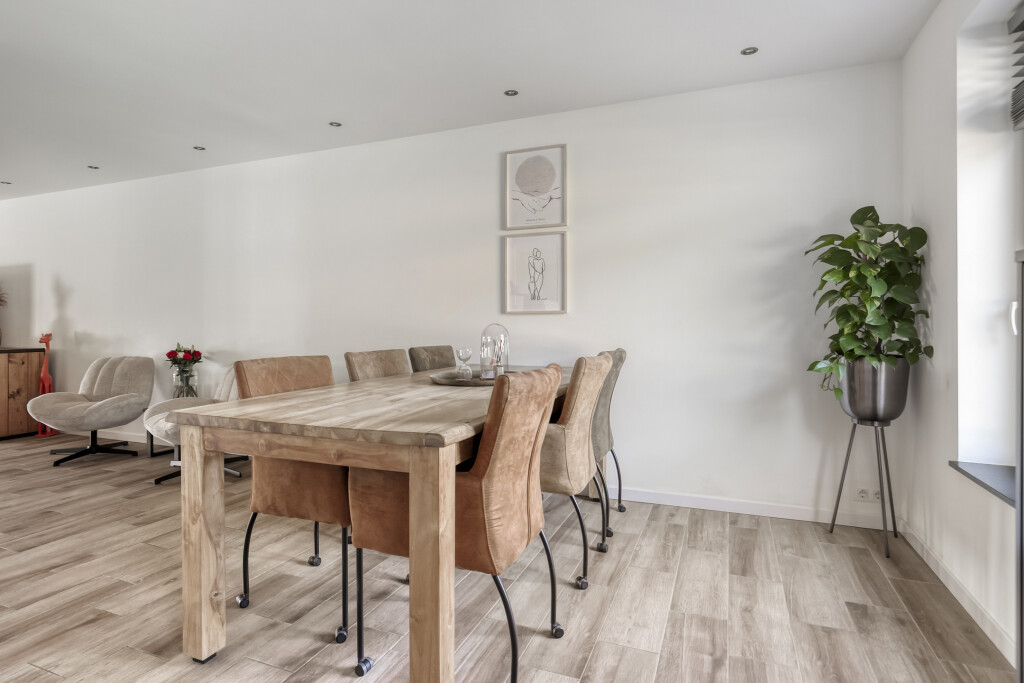 Bij binnenkomst betreedt u een ruime hal met toegang tot het moderne toilet en de praktische bijkeuken. Vanuit de hal komt u in de royale, lichte woonkamer met een open keuken. De keuken is uitgerust met een stijlvol kookeiland en moderne inbouwapparatuur, waaronder een inductiekookplaat uit 2024, afzuigkap, oven, koelkast, diepvries, vaatwasser, Quooker (2024) en een geïntegreerde koffiezetapparaat (2024). De openslaande deuren in de woonkamer geven direct toegang tot de zonnige achtertuin. De gehele begane grond is voorzien van comfortabele vloerverwarming.