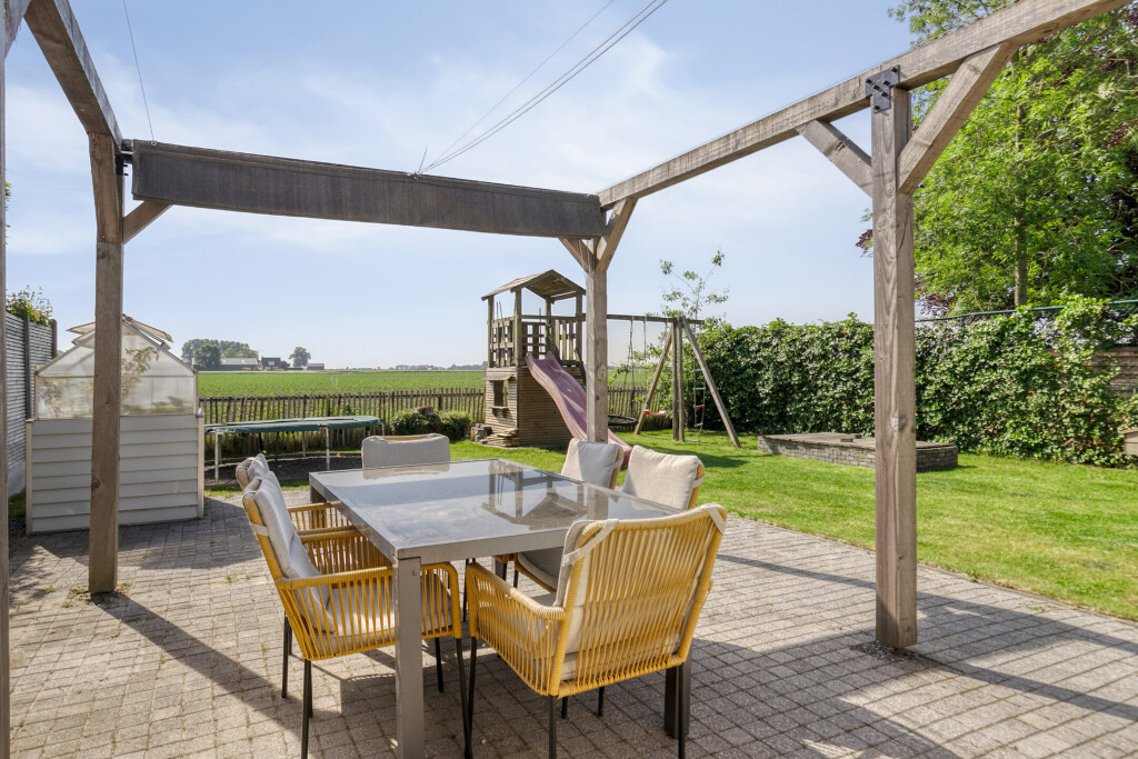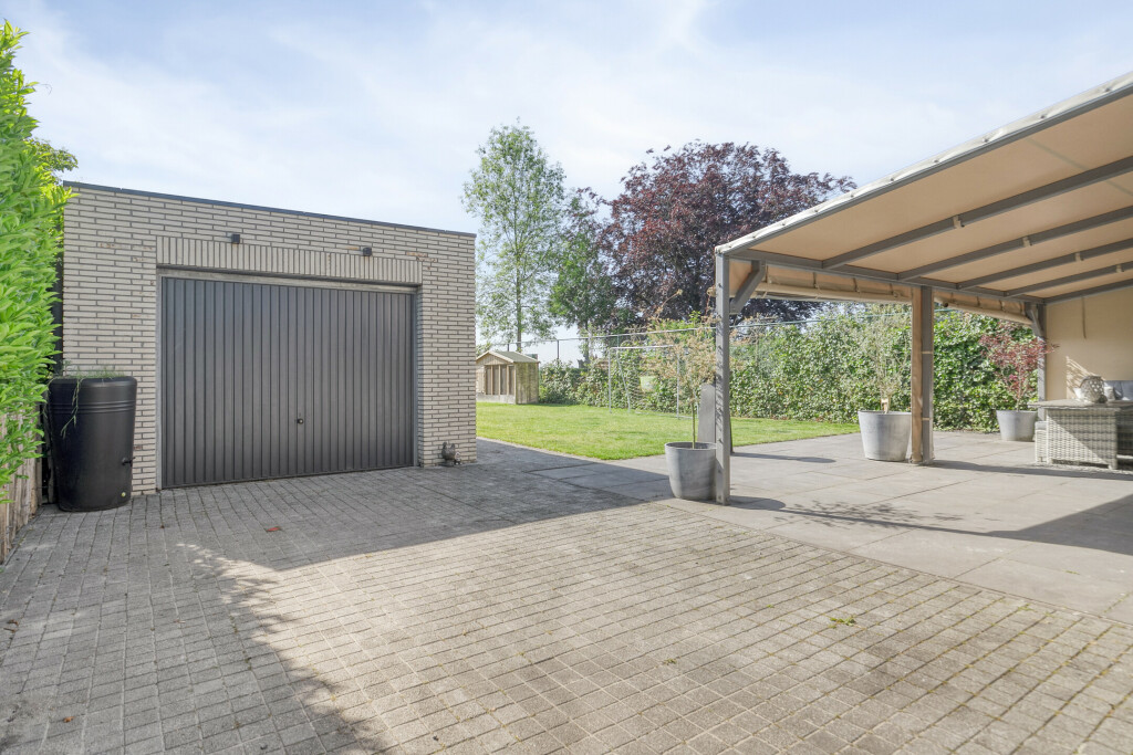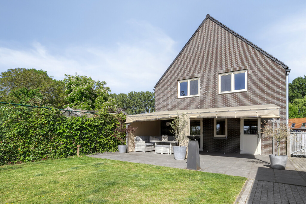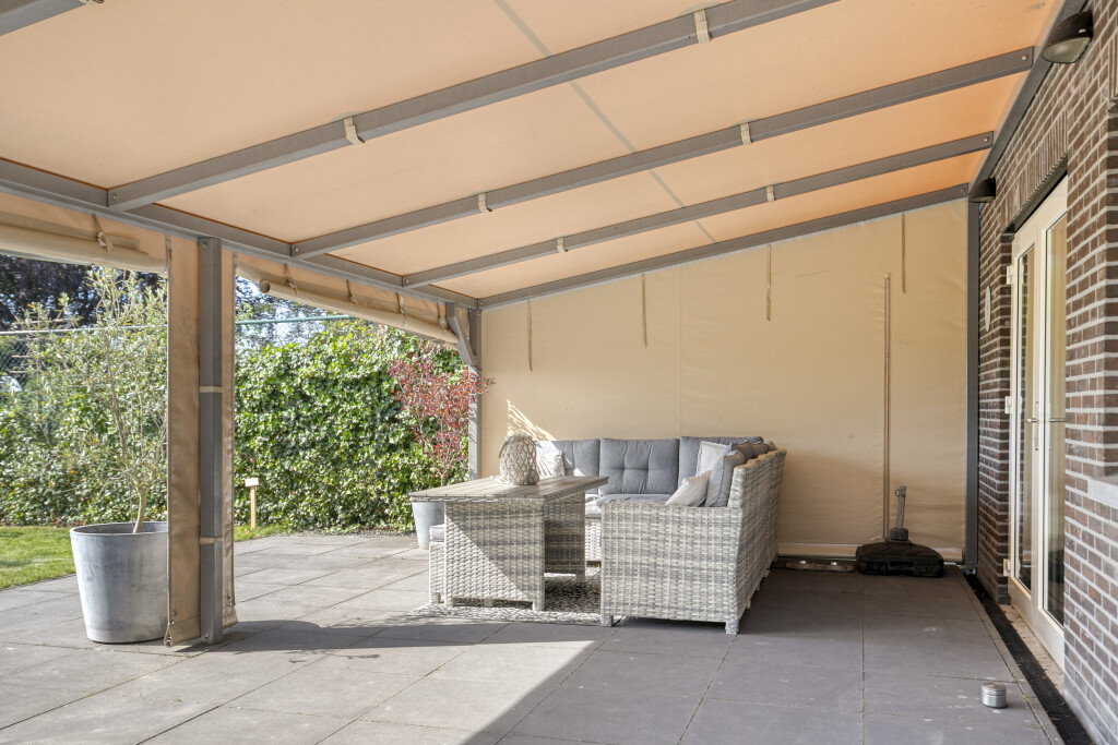 De rondom gelegen tuin biedt volop privacy en zon op elk moment van de dag. De fraai aangelegde achtertuin op het zuidoosten beschikt over een overkapping aan de woning met afsluitbare doeken, een heerlijke plek om beschut te genieten van het buitenleven. Op het ruime terras creëert u eenvoudig een comfortabele zit- en eethoek. De voortuin, gelegen op het noorden, biedt een ruime oprit met parkeergelegenheid en toegang tot de vrijstaande garage met berging in de achtertuin.