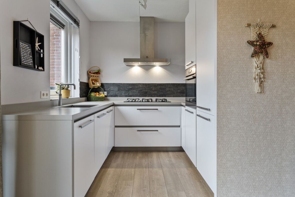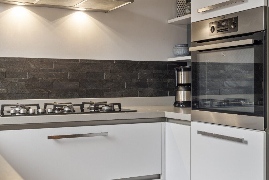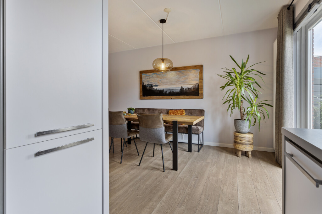 Aan de achterzijde bevindt zich de open keuken, die niet alleen praktisch is ingericht maar ook veel uitstraling heeft. Hier kun je met plezier koken en samen zijn met familie of vrienden. De keuken is voorzien van moderne inbouwapparatuur, waaronder een vaatwasser, combi-oven, inductiekookplaat, afzuigkap, koel-vriescombinatie en een handige Quooker. Alles binnen handbereik, ideaal voor wie houdt van koken, borrelen en tafelen in goed gezelschap.