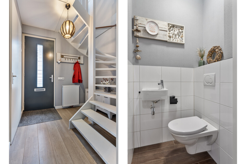 Je wordt welkom geheten in een nette hal met toegang tot het toilet met fonteintje, de meterkast en de trap naar boven. Vanuit de hal stap je de ruime woonkamer in, waar meteen een gevoel van rust en ruimte overheerst. De grote ramen aan de voor- én achterzijde zorgen voor een overvloed aan daglicht, waardoor de kamer een warme en uitnodigende sfeer heeft. De lichte laminaatvloer die door de hele begane grond is doorgelegd versterkt het ruimtelijke en verzorgde gevoel.