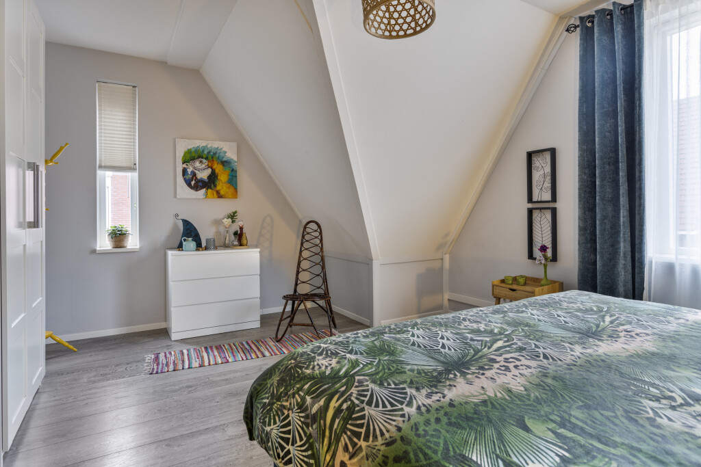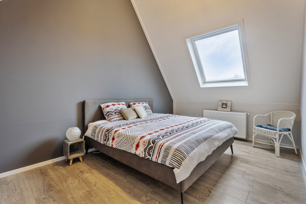 Via de vaste trap bereik je de tweede verdieping, die verrassend veel ruimte biedt. Hier is een sfeervolle vierde slaapkamer gerealiseerd, met grote dakramen die zorgen voor veel natuurlijk licht. Het is een plek die direct prettig aanvoelt – ruim genoeg voor een groot bed en een bureau, maar ook knus genoeg om er een gezellige logeerkamer of inspirerende werkruimte van te maken.
