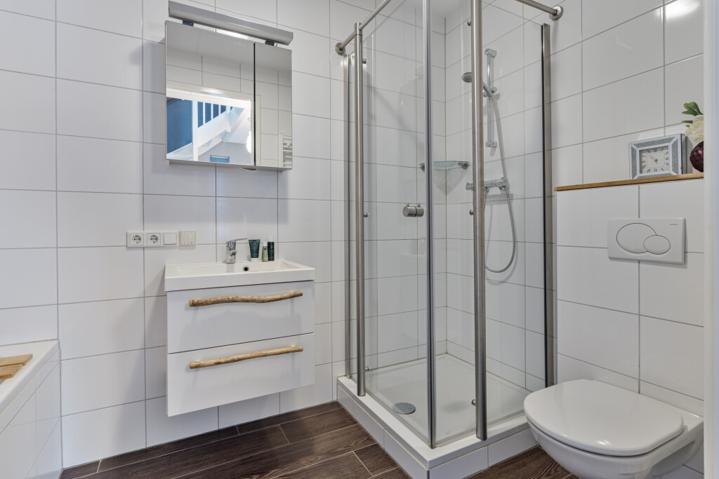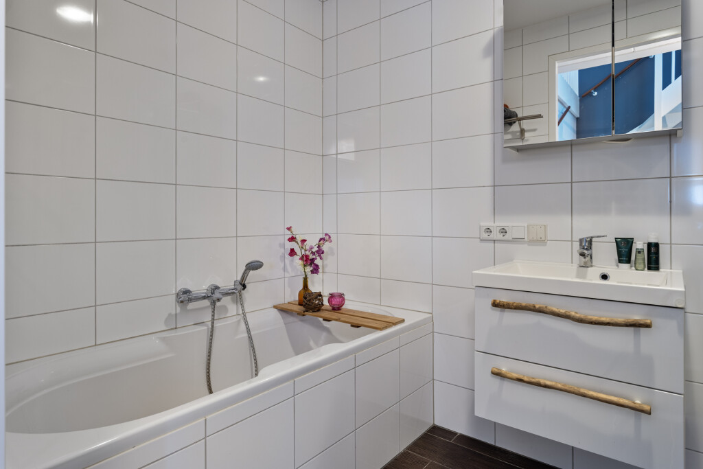 De badkamer is een fijne ruimte om te ontspannen en volledig uitgerust met een ligbad, aparte douche, wastafel en toilet. De lichte kleurstelling en nette afwerking geven de badkamer een frisse, tijdloze uitstraling, terwijl de praktische indeling ervoor zorgt dat alles precies op de juiste plek zit. Hier begin je je dag fris en ontspannen, of kom je na een drukke dag heerlijk tot rust in het bad.