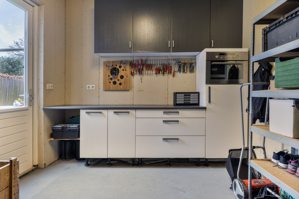De ruime garage maakt het geheel compleet. Hier is voldoende plek voor fietsen, gereedschap en seizoensspullen. Dankzij het ingebouwde aanrecht met spoelbak is de ruimte ook uitstekend geschikt voor kleine klus- of schoonmaakwerkzaamheden.