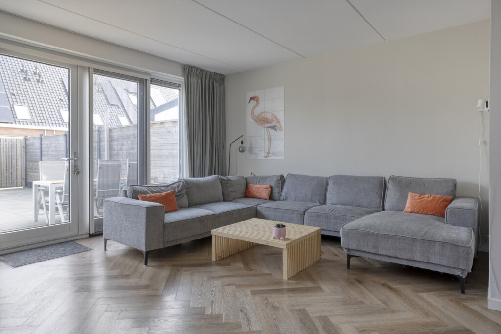 De woonkamer is gezellig en licht, voorzien van een elektrische haard die voor extra sfeer zorgt. Onder de trap is een praktische voorraadkast aanwezig. Vanuit de woonkamer stap je zo de tuin in.