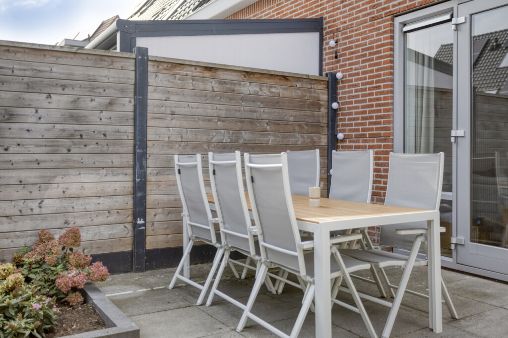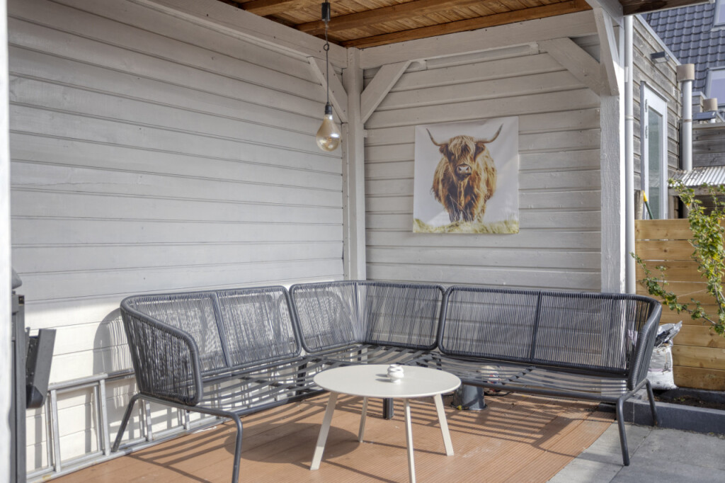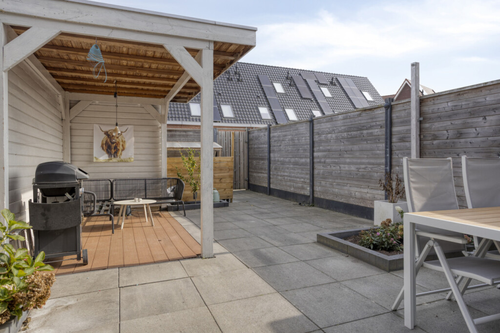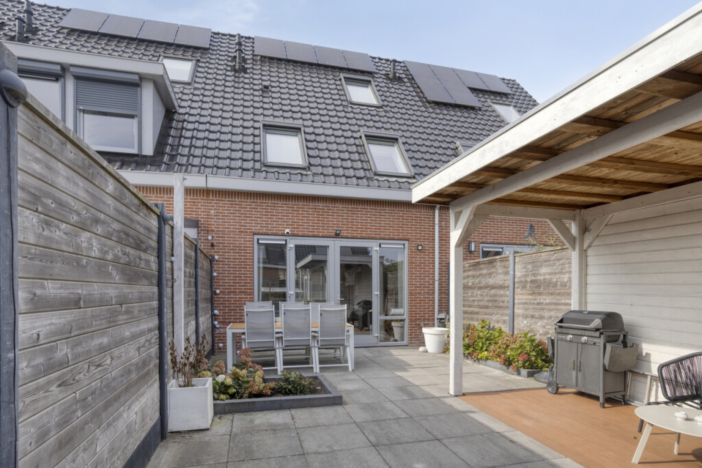 De achtertuin is onderhoudsvriendelijk aangelegd en beschikt over een vrijstaande houten berging met overkapping. Ideaal om spullen op te bergen en om ook bij regenachtig weer buiten te kunnen genieten.