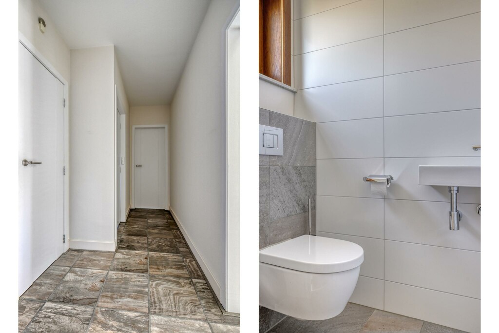U komt binnen in een ruime hal met toilet en meterkast. Vanuit de hal gaat u via de keuken naar de royale woonkamer. Aan de achterzijde kunt u via de bijkeuken en keuken naar de rechte woonkamer. In de woonkamer is ruimte voor een grote eettafel en een zithoek. De woonkamer is heerlijk licht door de verschillende ramen en schuifpui. De keuken is in een hoekopstelling en voorzien van een koelkast, combi-/oven, vaatwasser, 4- pits gaskookplaat en een afzuigkap. Ook hier is een fijne schuifpui naar het terras. Vanuit de hal aan de voorzijde van de woning bereikt u de grote slaapkamer en gaat u verder in de gang dan treft u hier de moderne badkamer, welke in 2018 is vernieuwd in een neutraal design en voorzien van een inloopdouche, wastafel, toilet en radiator. Aan het eind van de gang zit de kleine slaapkamer.