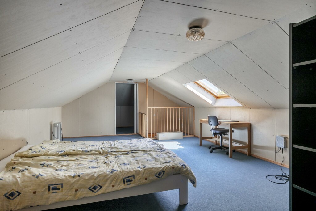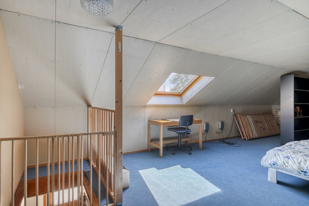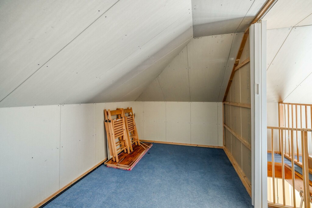 Vanuit de bijkeuken een trap naar de verdieping, dit is nu nog een vlizotrap maar hier kunt u ook een vaste trap van maken. Boven komt u in een grote open ruimte waar u in het midden gemakkelijk kunt staan, aan de achterzijde is een dakraam. Aan de zijkant is een kleine kamer welke geschikt is als berging.