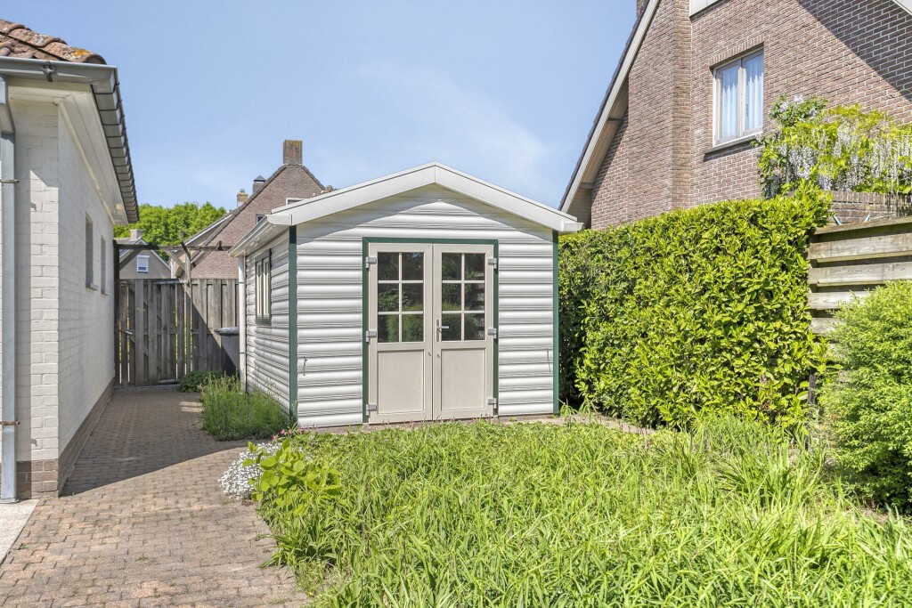 Grenzend aan de woning een ruim terras op het zonnige zuiden, hierdoor kunt u de hele dag genieten van de zon. Daarnaast een groot gazon met buitenverlichting en aan de rand bloemborders en een authentiek prieel, waardoor u op een zonnige dag ook in de schaduw kunt zitten. Naast de woning staat een ruim tuinhuis, uitgevoerd in kunststof en voorzien van een betonnen vloer, dubbele toegangsdeur en een dubbel raam met draai-/kiepfunctie, verder is er ook elektra aanwezig.