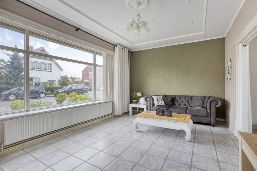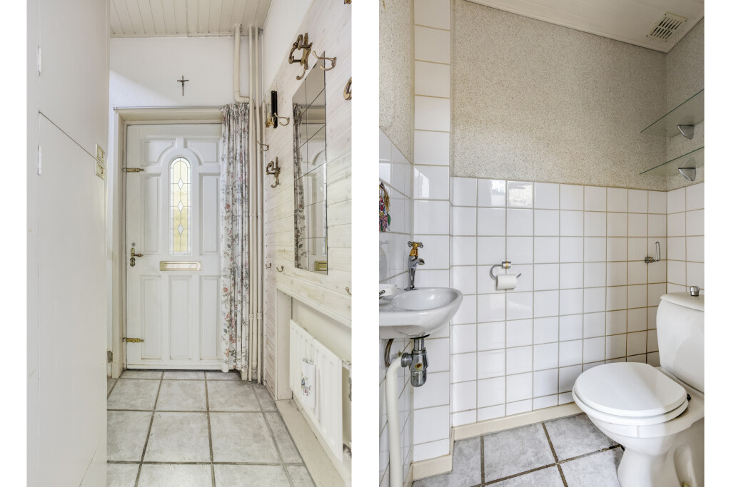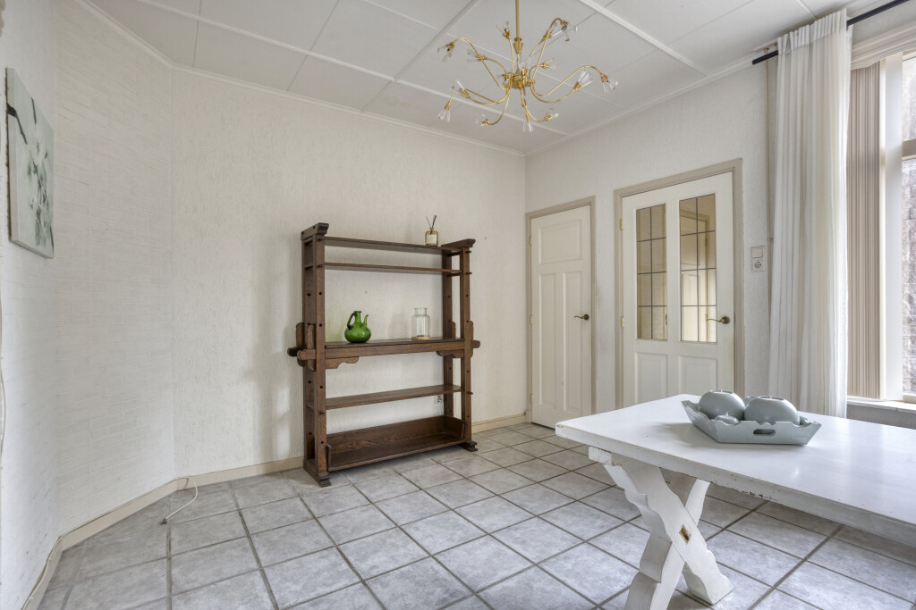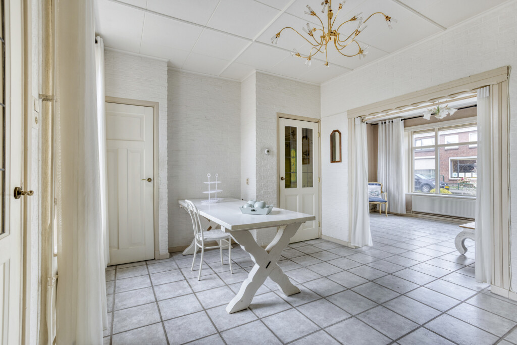 Entree via de hal met tegelvloer, meterkast en trap naar de eerste verdieping. Vervolgens kom je in de woonkamer waar de tegelvloer is doorgelegd en de voormalige ensuite indeling nog aanwezig is. De woonkamer heeft dankzij het zijraam extra daglicht. De eetkamer is voorzien van een ingebouwde kast en van hieruit is de trapkast te bereiken.