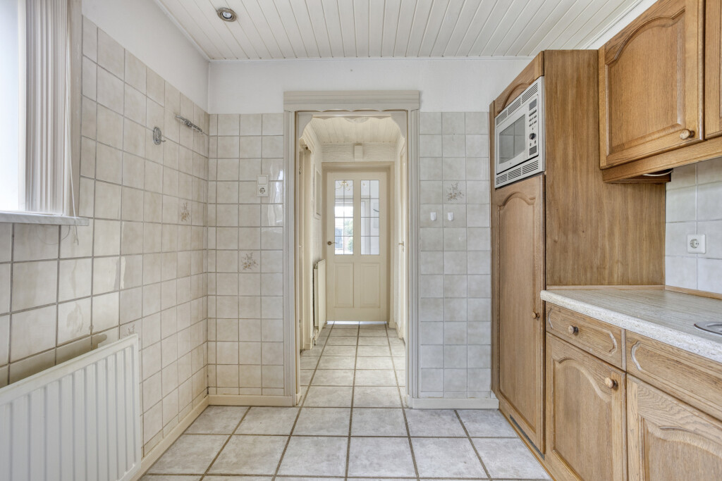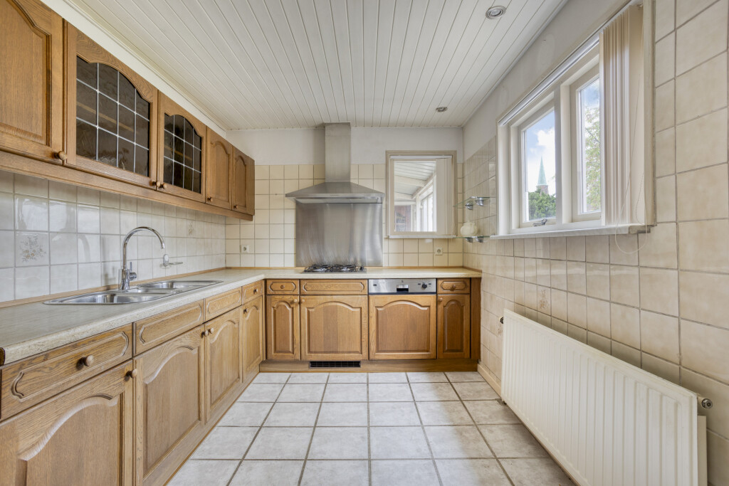 Aan de achterzijde is de woning uitgebouwd met een 2e hal waar zich tevens het toilet met fontein bevindt. Aansluitend is de keuken gesitueerd. Deze is opgesteld in een hoekopstelling met onder- en bovenkasten. Verder beschikt de keuken over;