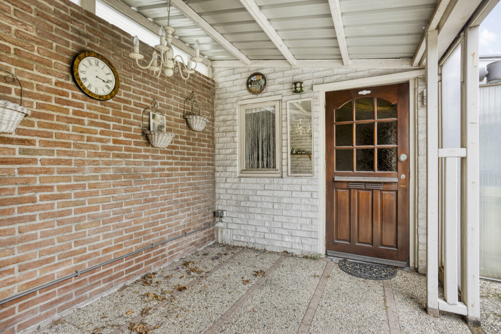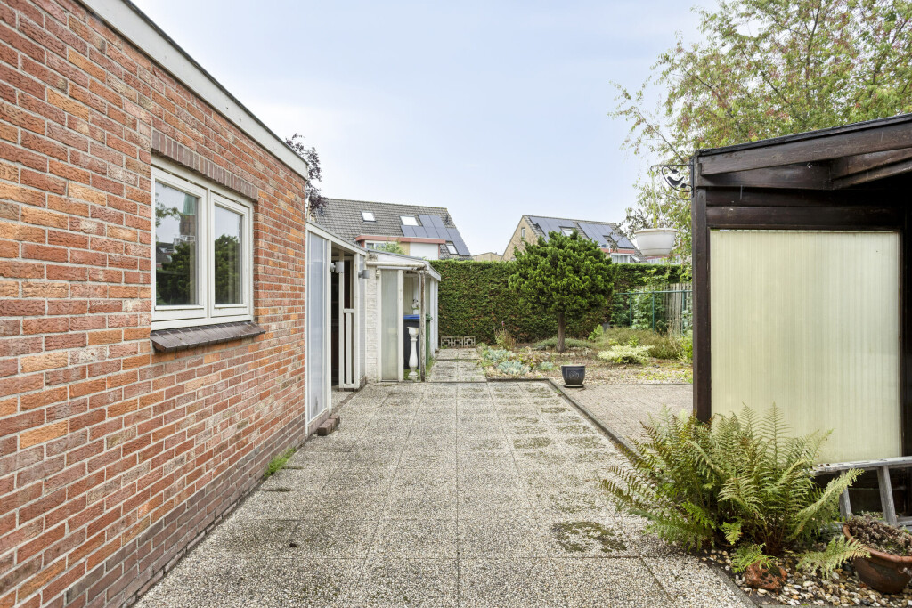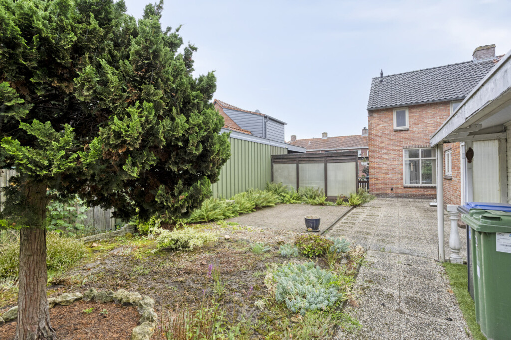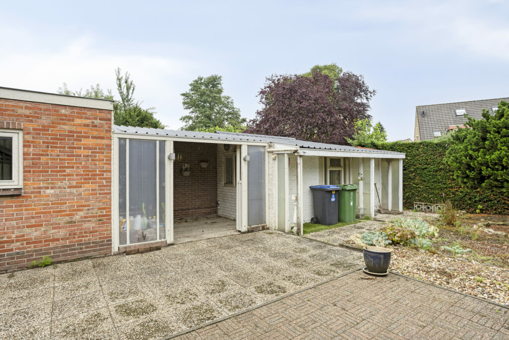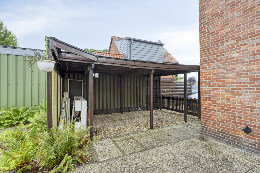 De ruime achtertuin is grotendeels betegeld en nog naar eigen wensen en smaak in te delen. Achter de aanbouw is nog een overkapping met een stenen berging voor het opbergen van tuinmeubilair en gereedschap. Aan de zijkant van woning is een oprit met carport waar met gemak 3 auto's geparkeerd kunnen worden.