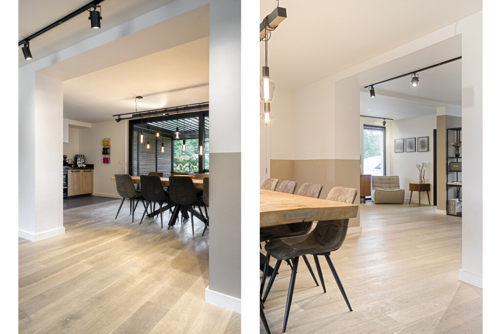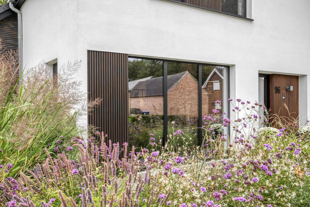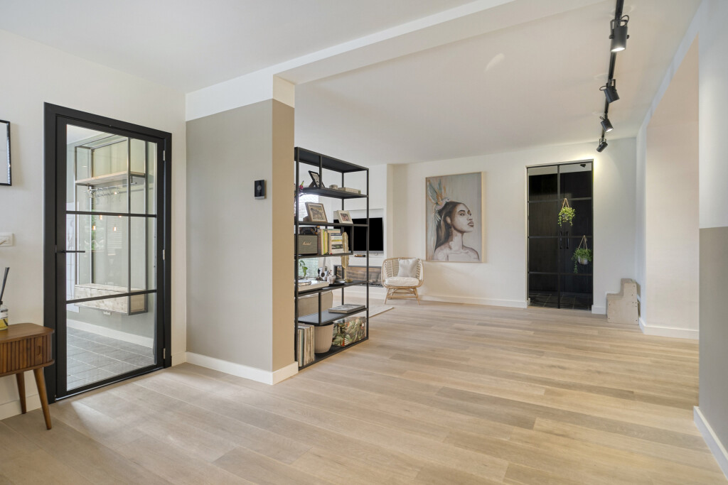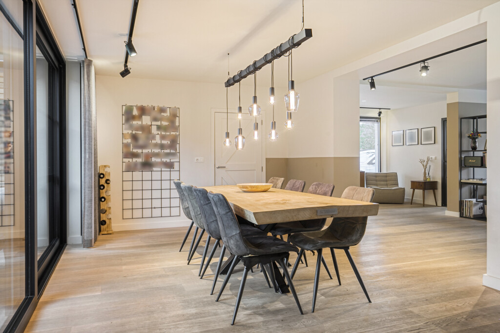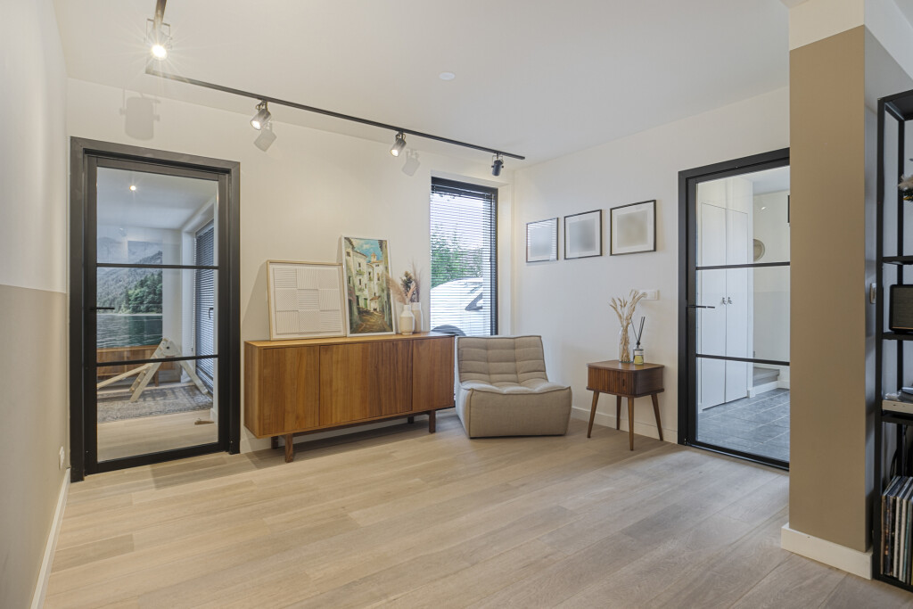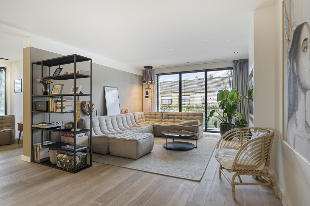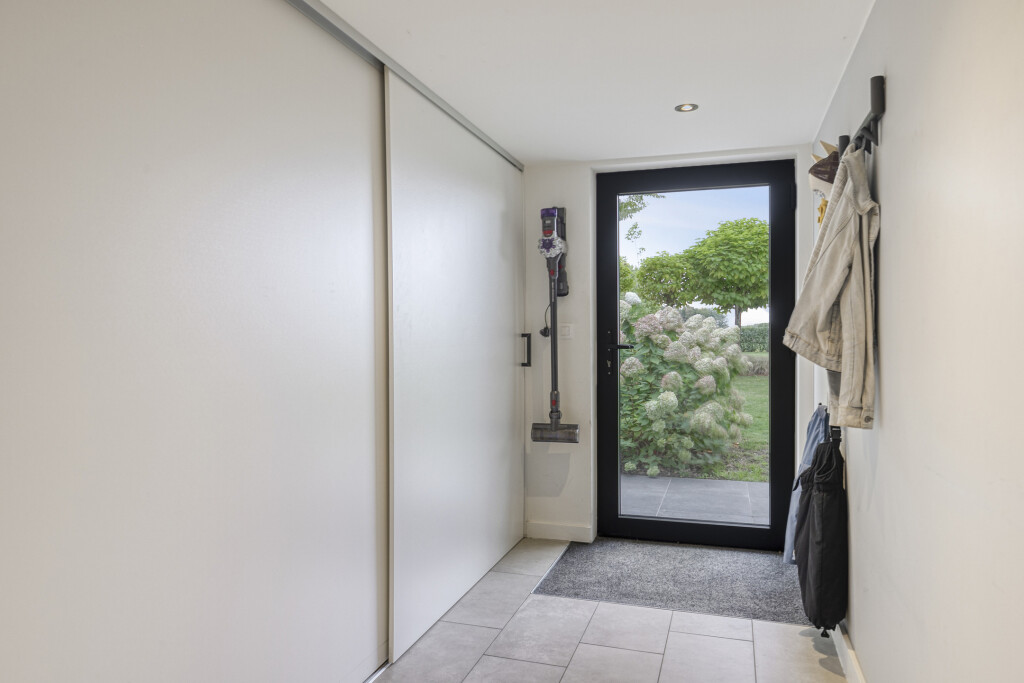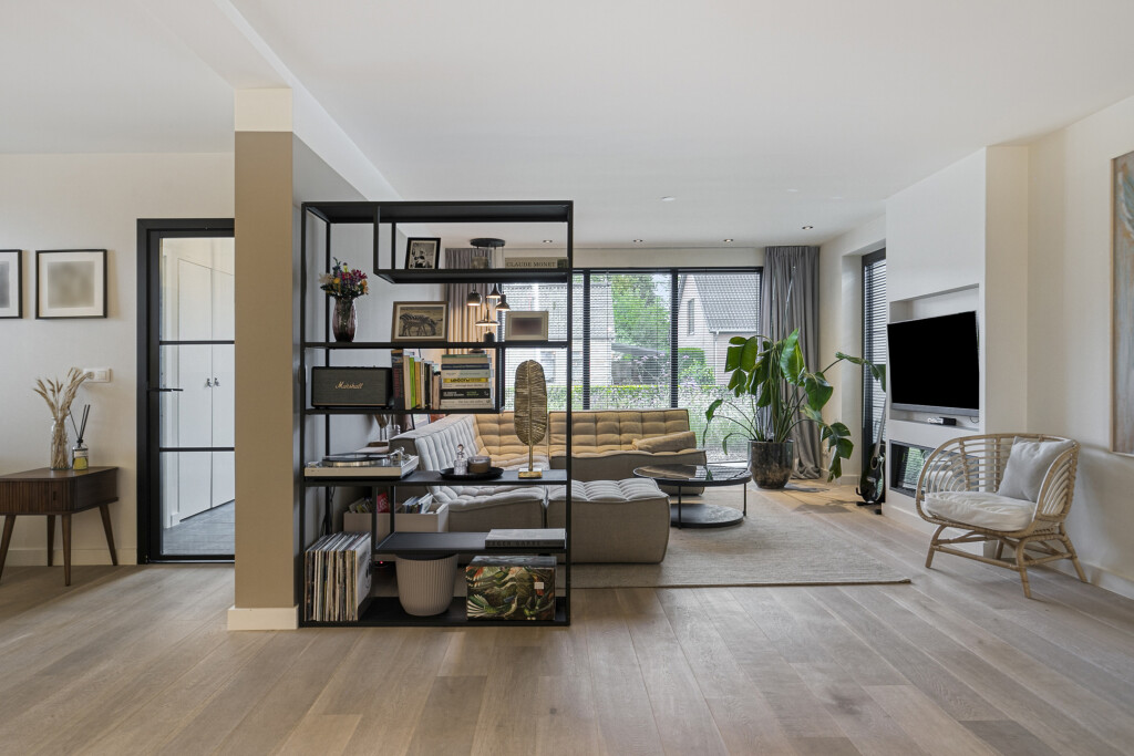 Al in de hal proef je de zorg en aandacht waarmee dit huis is afgewerkt. De stijlvolle tegelvloer, het toilet zonder drempel en de praktische inbouwkasten zorgen voor een strakke eerste indruk. Via de elegante glazen deur stap je de woonkamer binnen. Grote ramen van vloer tot plafond zorgen voor een ruimtelijk gevoel, terwijl de white wash eikenvloer en de sfeervolle elektrische haard warmte en gezelligheid brengen. Overal zorgen subtiele inbouwspots voor de juiste sfeer op elk moment van de dag.