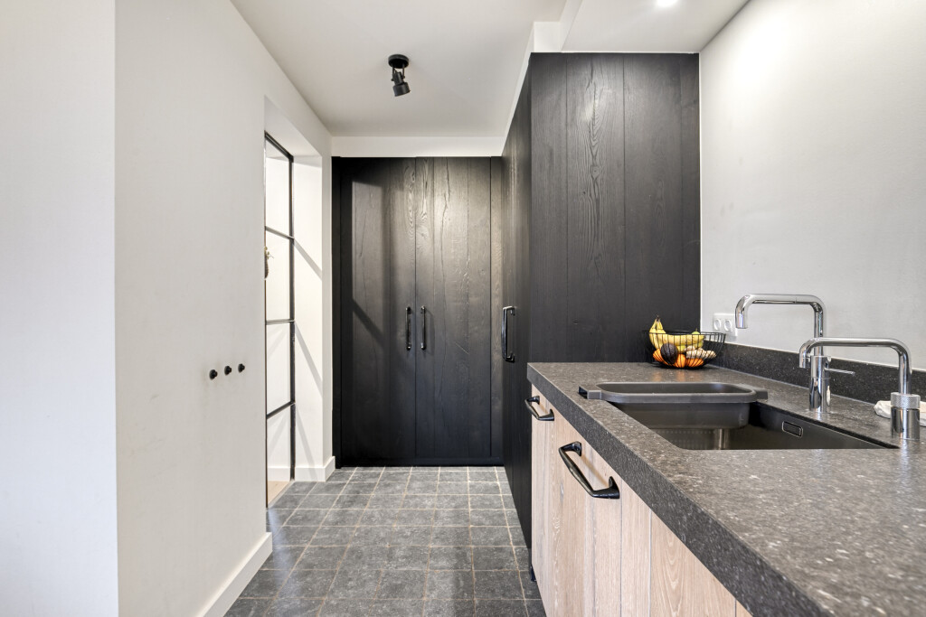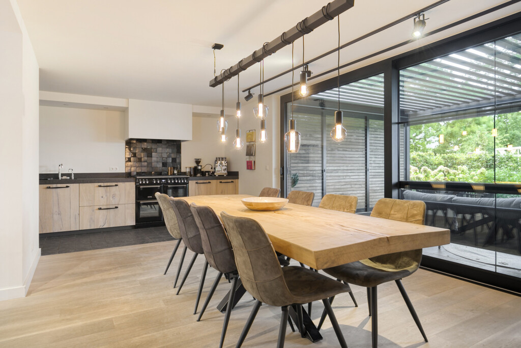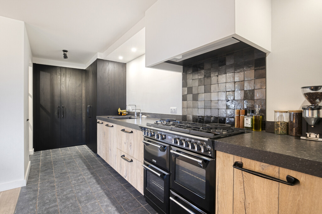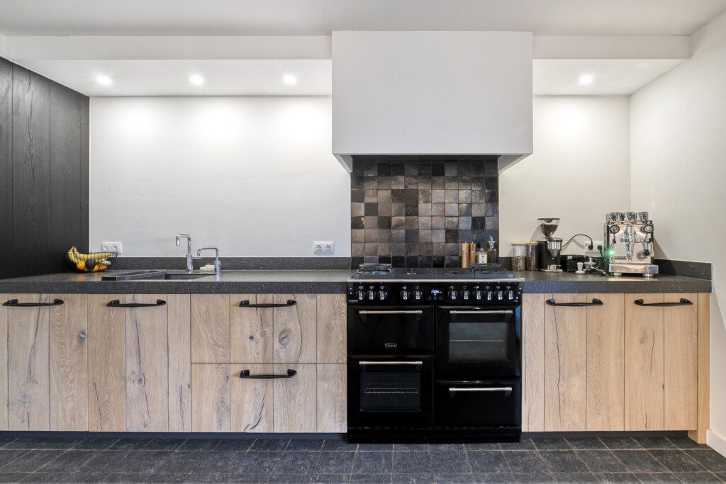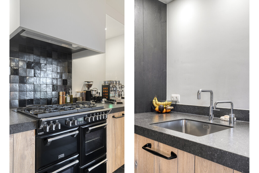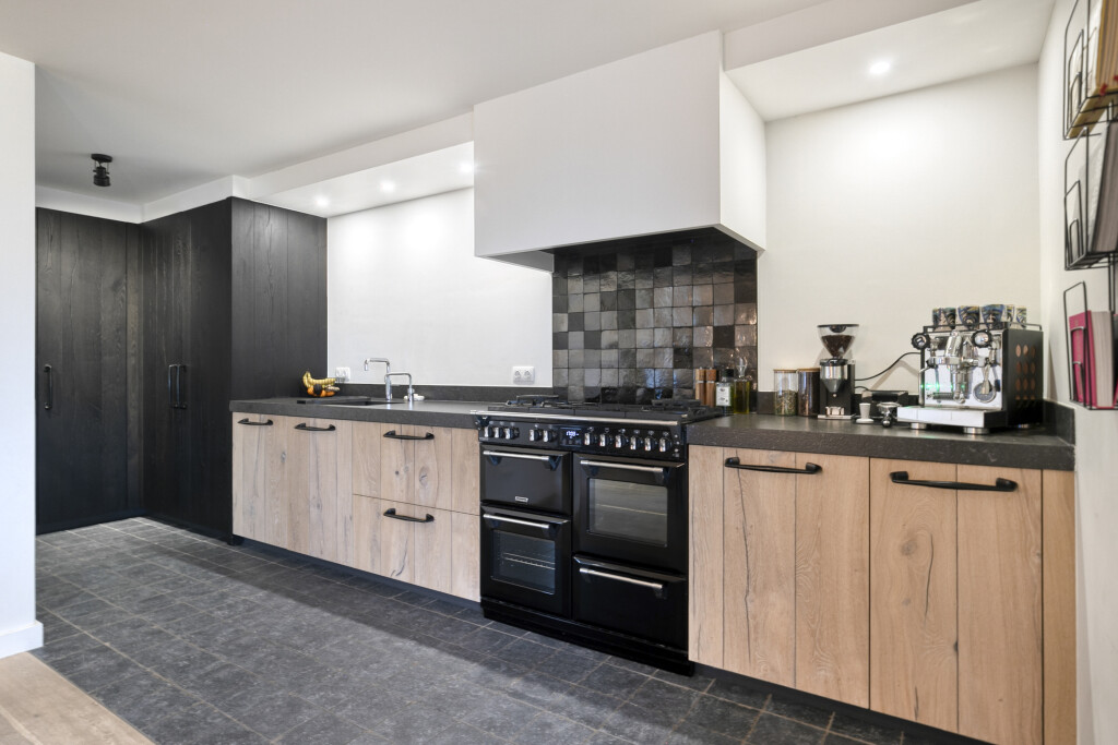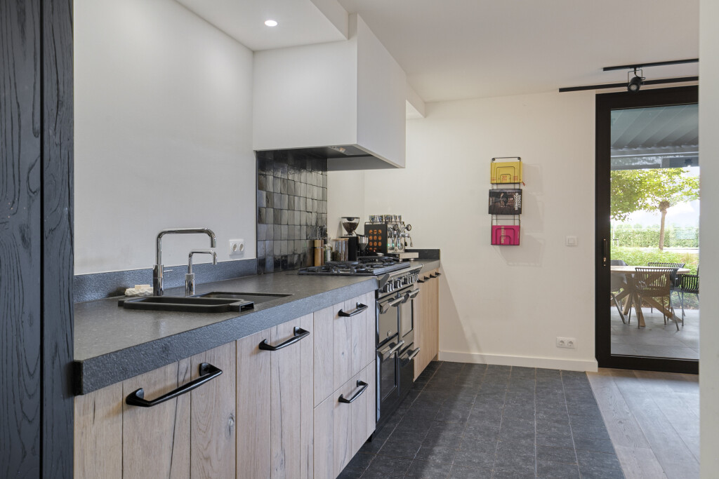 De eetkamer en keuken vormen samen het hart van de woning. Dankzij de grote schuifpui vloeien binnen en buiten hier naadloos samen. De keuken is royaal opgezet en voorzien van alles wat je van een moderne leefkeuken mag verwachten: een indrukwekkend 6-pits fornuis van Stoves, een quooker, vaatwasser en een royale koelkast. De bijkeuken â strak afgewerkt met inbouwkasten â biedt extra gemak en plek voor onder andere de wasapparatuur.
