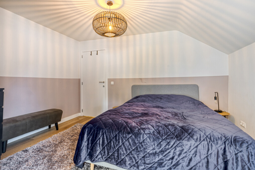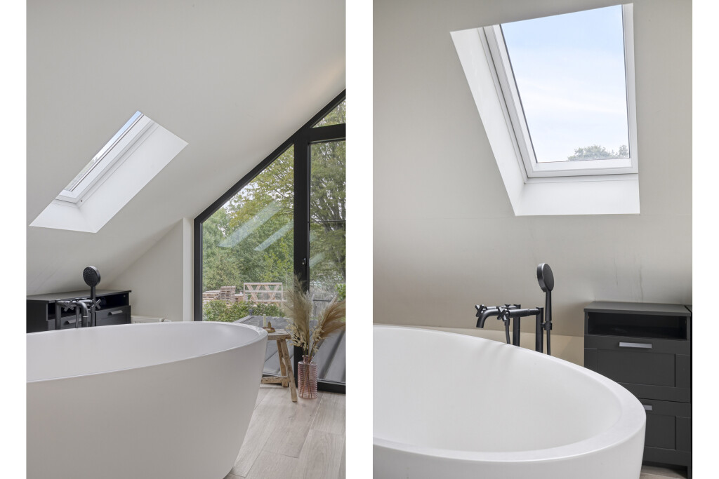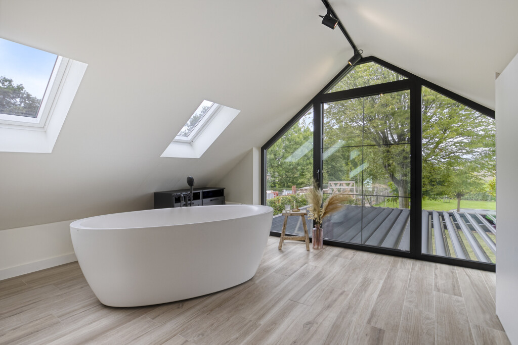 Op de bovenverdieping vind je drie slaapkamers, waarvan de grootste een bijzondere verrassing biedt: een ligbad met vrij uitzicht over de tuin en de landerijen, zonder dat iemand naar binnen kan kijken.