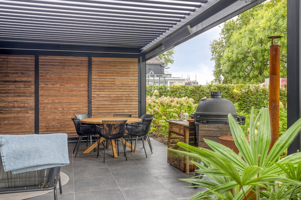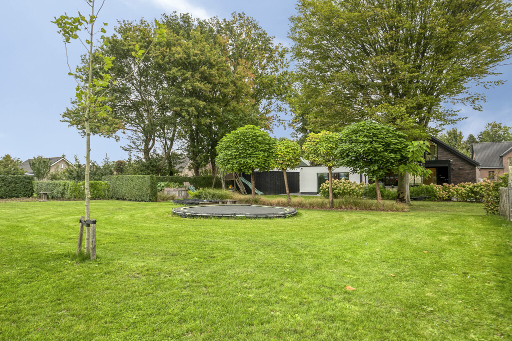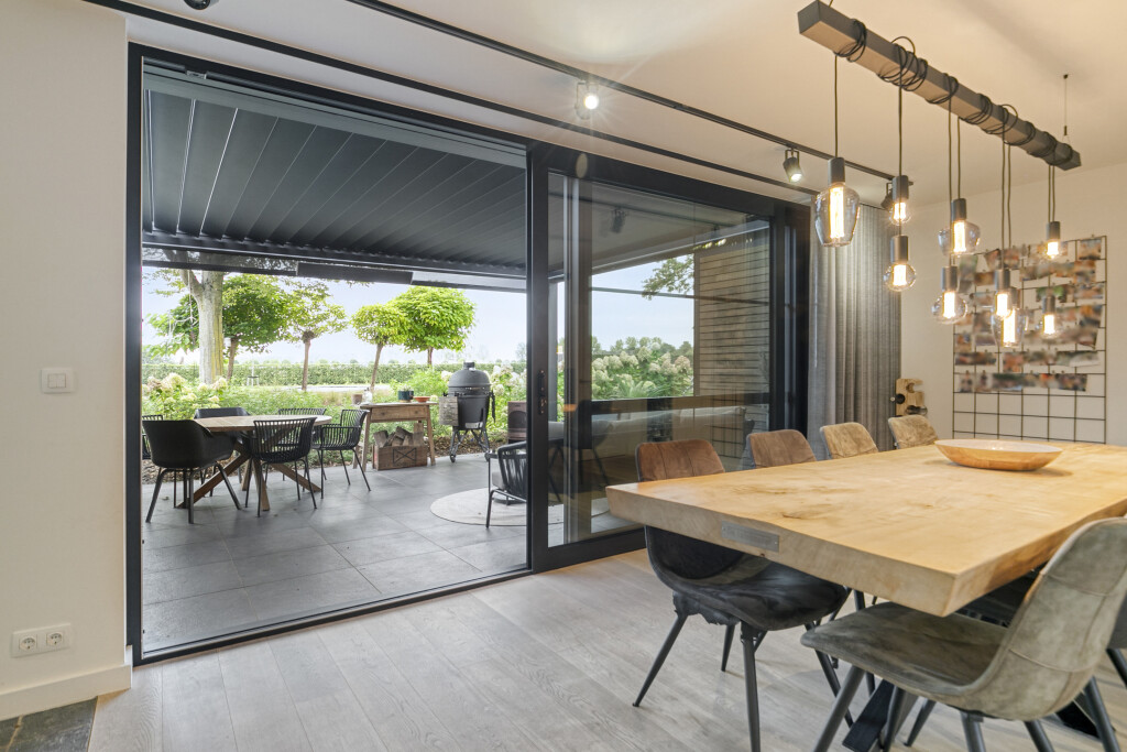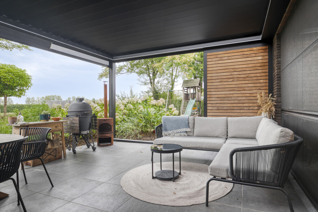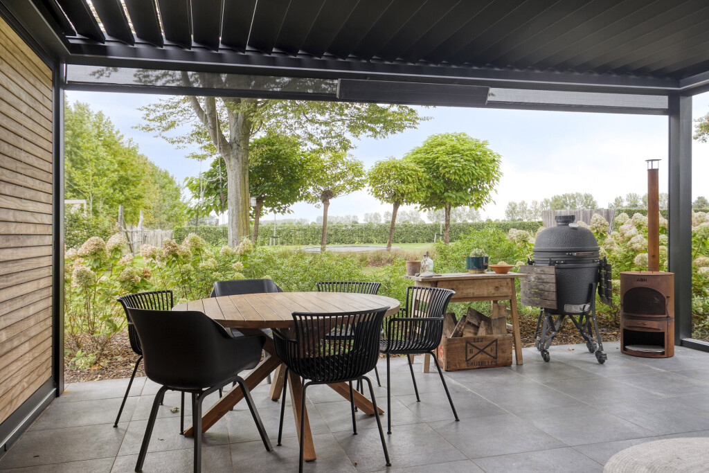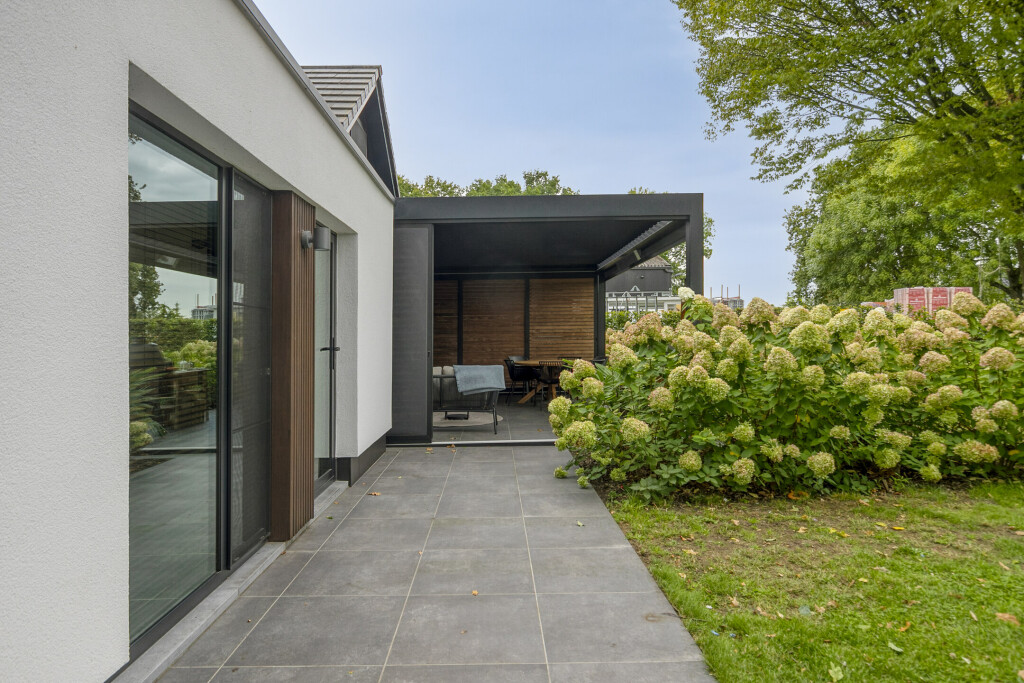 Buiten gaat het genieten verder. Vanuit de eetkamer stap je zo onder de afsluitbare overkapping. Met zonnescreens, verwarming, een regensensor én een dak dat automatisch meebeweegt met de zon, beleef je hier elk seizoen in optimaal comfort. De ruime tuin met vrij uitzicht geeft een gevoel van rust en vrijheid.