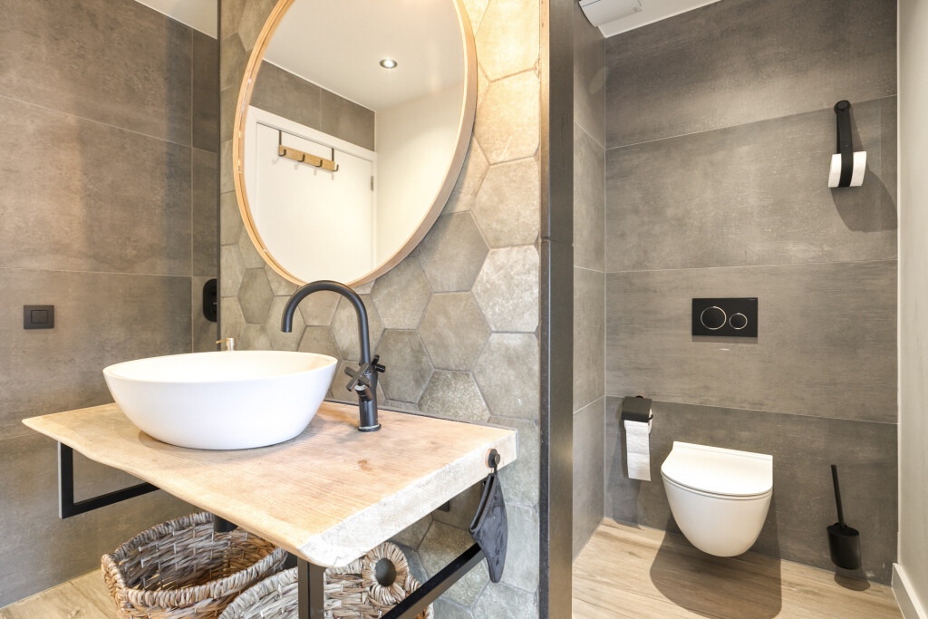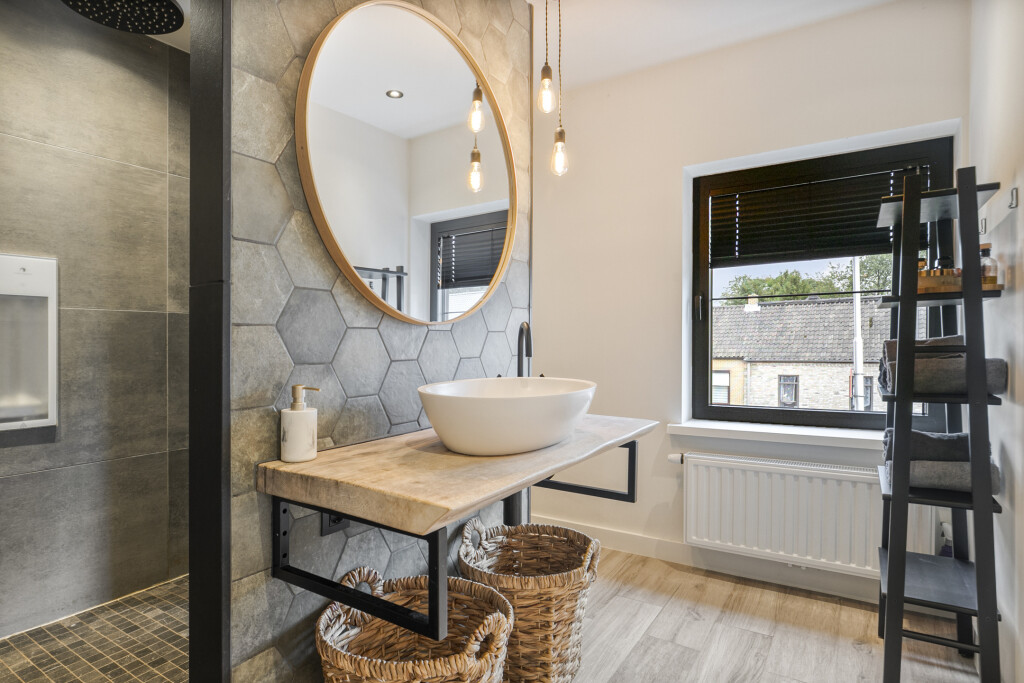 De badkamer is stijlvol ingericht met een inloopdouche, wastafelmeubel en tweede toilet.