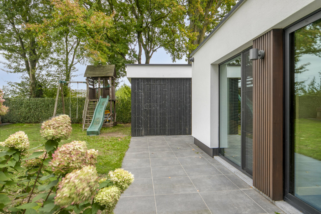 Een vrijstaande stenen berging met elektra maakt het plaatje compleet.