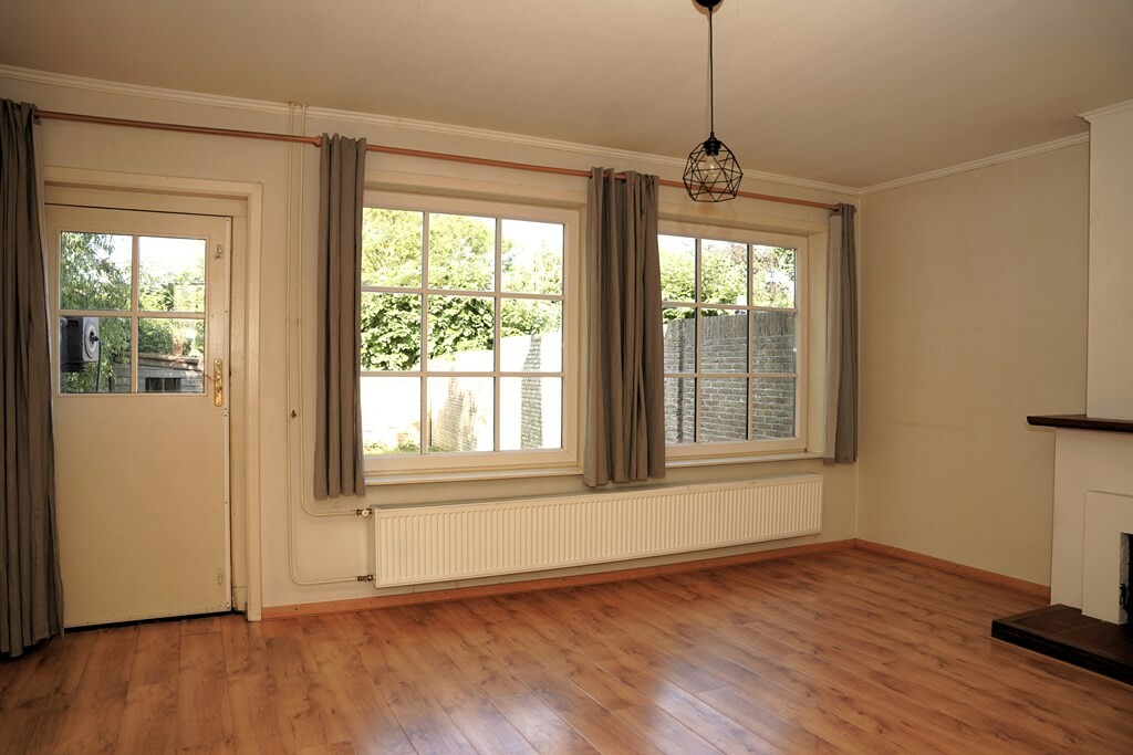 Vervolgens kom je in de woonkamer met gezellige sfeerschouw en de deur naar de tuin. De ramen naar de tuinkant, verdeeld in kleine ruitjes door middel van smalle latjes, geven deze kamer een landelijke uitstraling.
