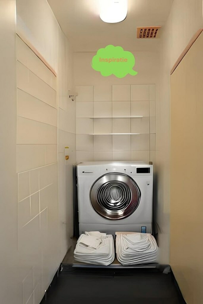 Wat ooit de badkamer was, is nu een ruimte met aansluiting voor het witgoed.