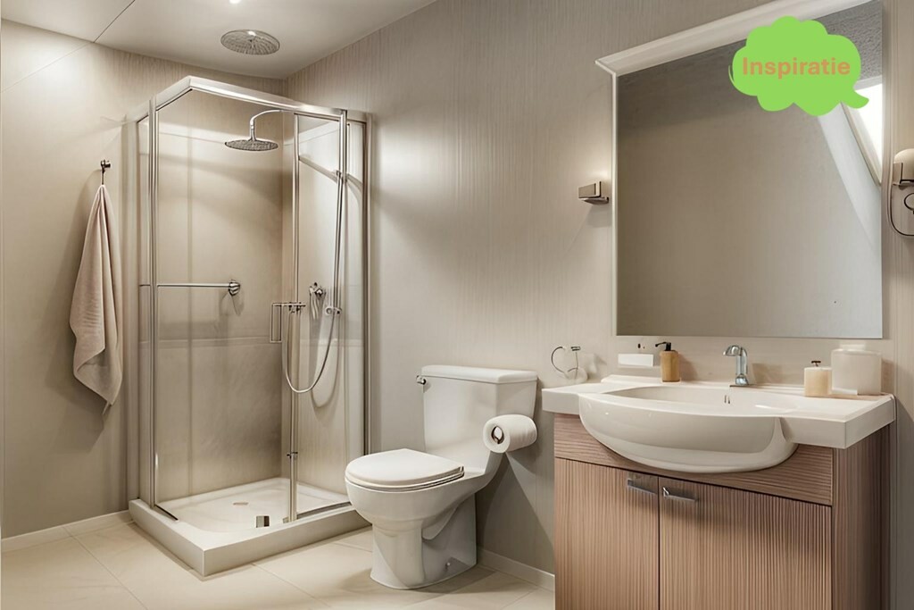 De riante, maar eenvoudige badkamer beschikt over een douchecabine, een wastafel en een sanibroyeur. Een veluxraam zorgt voor extra lichtinval.