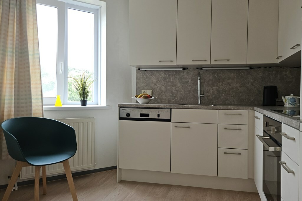De halfopen keuken is uitgerust met inductiekookplaat, afzuiging, vaatwasser en koelkast, alles wat je nodig hebt om snel én lekker te koken.