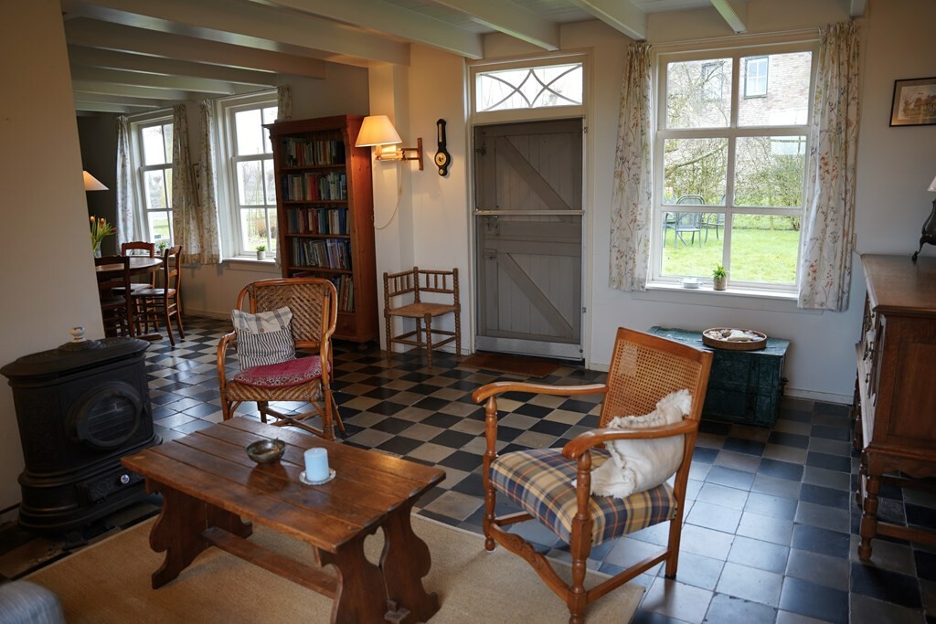 Vervolgens kom je in de zeer ruime woonkamer, die is voorzien van een fraai balkenplafond en de oorspronkelijke, geblokte plavuizen vloer. Een ouderwetse, zogenaamde “paardendeur” geeft vanuit de woonkamer toegang naar de tuin.