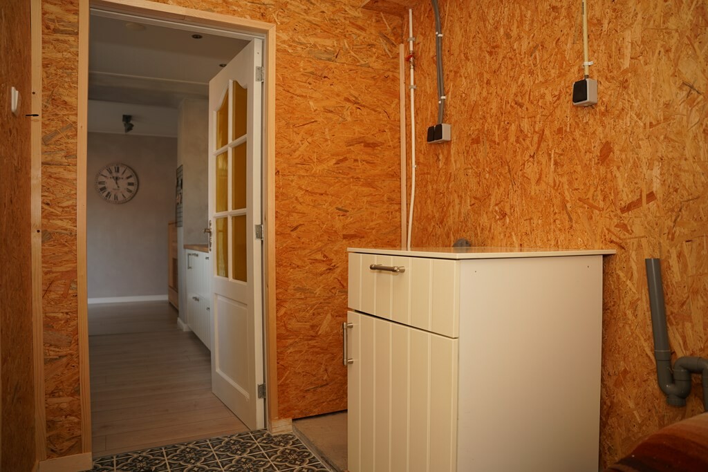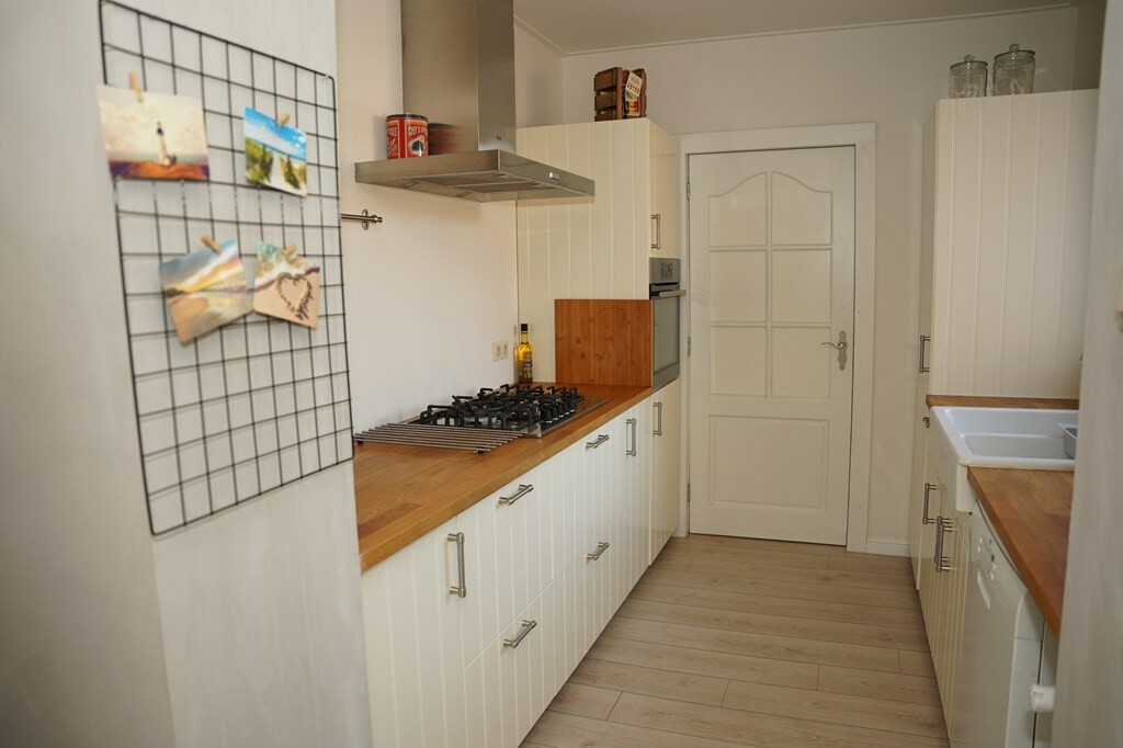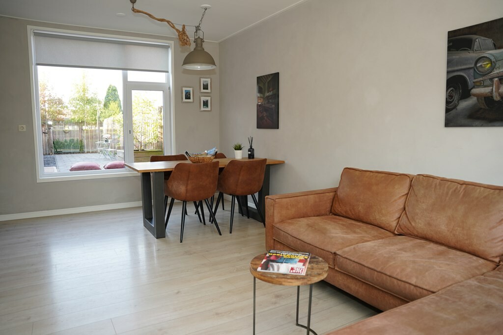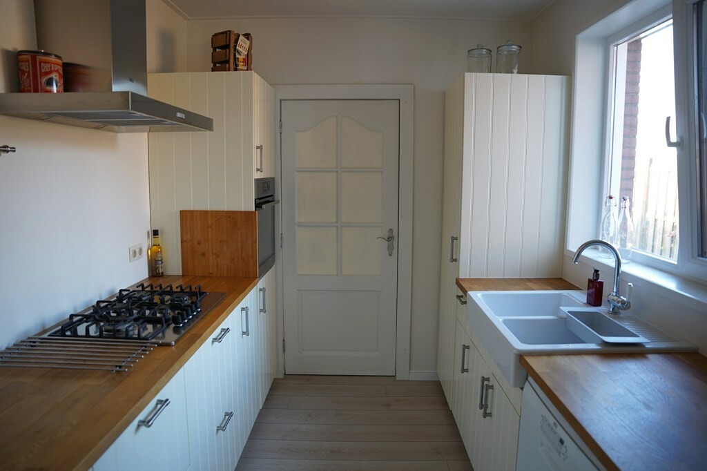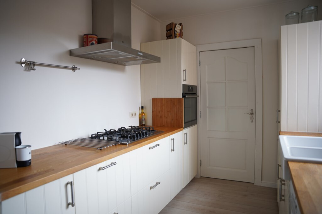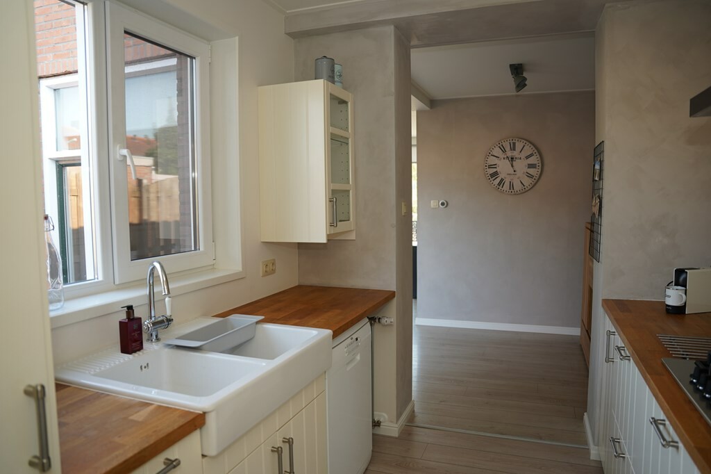 Je komt binnen in een nette hal met moderne meterkast, toilet en trap naar boven. De ruime L-vormige woonkamer met laminaatvloer baadt in het licht en sluit aan op de halfopen landelijke keuken, voorzien van moderne apparatuur. De geïsoleerde bijkeuken biedt plaats aan witgoed en geeft toegang tot de tuin.