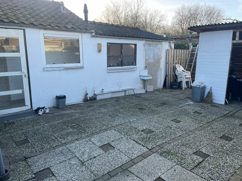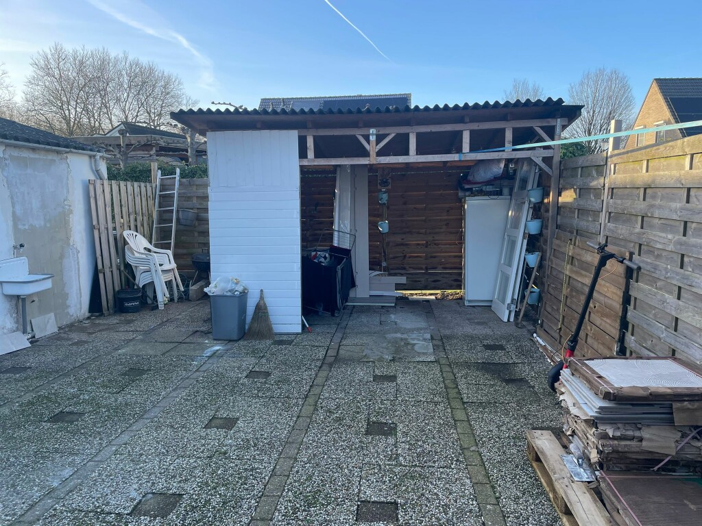 Achtertuin op het noordwesten gelegen, geheel aangelegd in terrastegels, met zijdeur naar oprit.