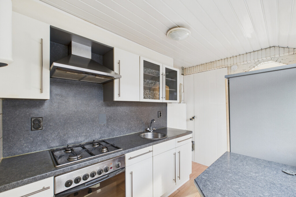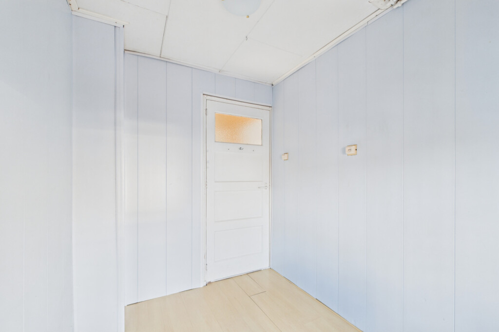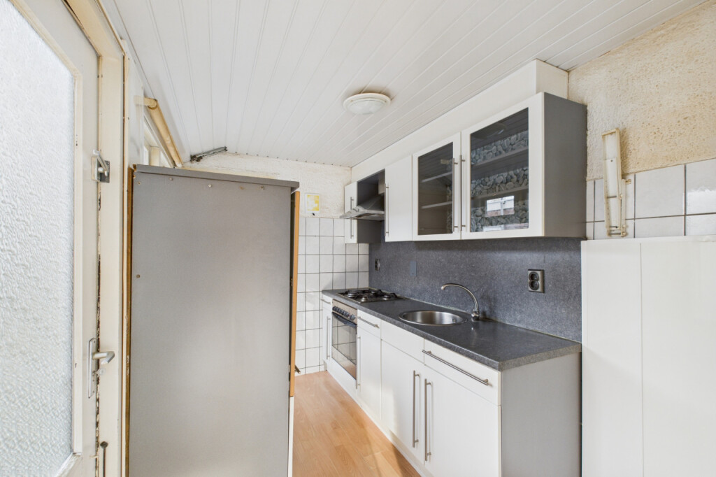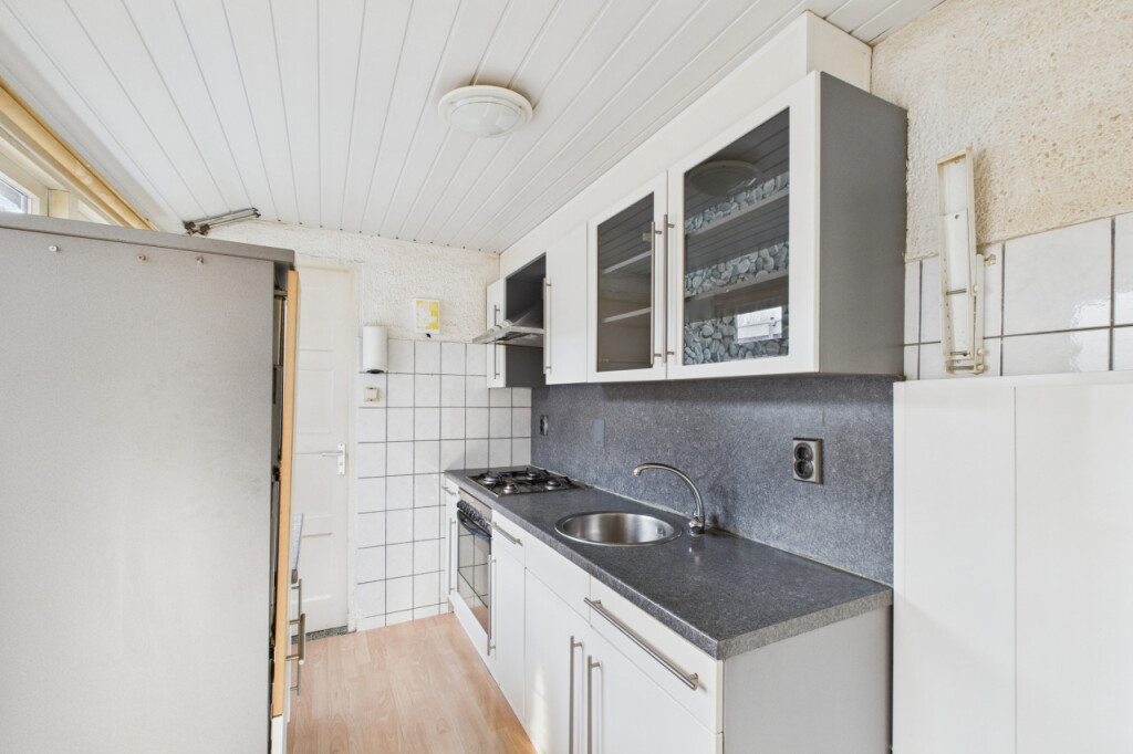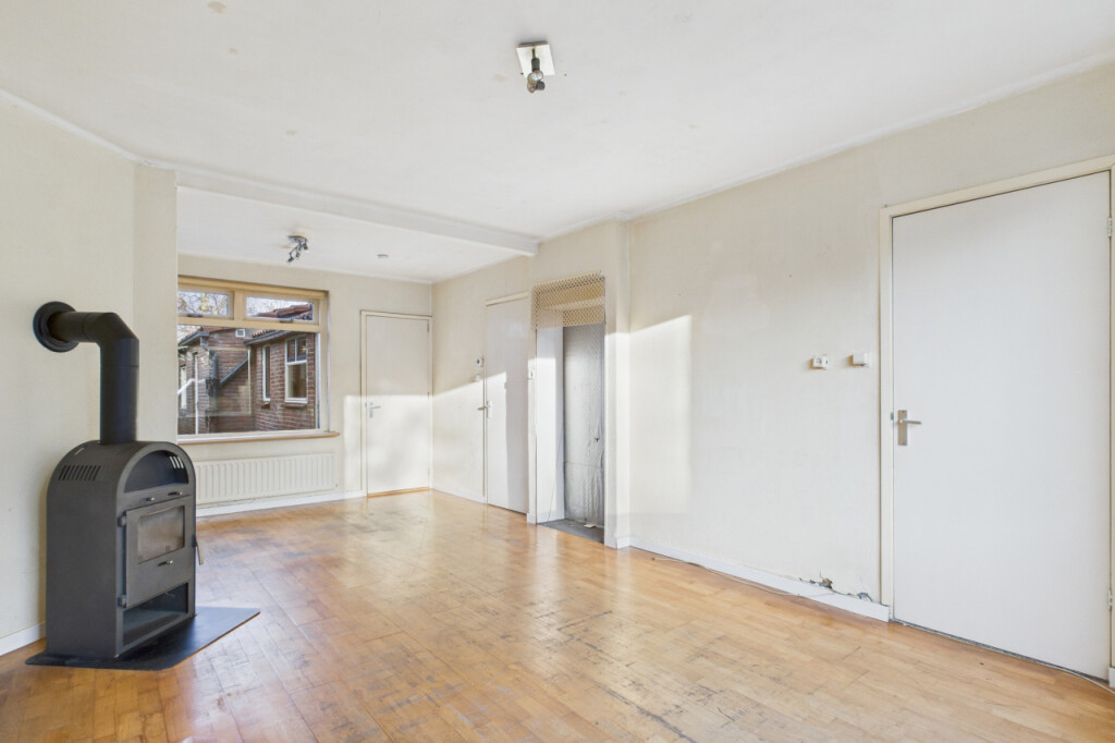 Je komt de woning binnen in de hal met meterkast en de trapopgang naar de eerste verdieping. Vanuit hier stap je de lichte doorzonwoonkamer binnen, waar de houtkachel zorgt voor extra sfeer en warmte. Aansluitend bevindt zich een portaal met toegang tot de praktische trapkast en het toilet. De dichte keuken is geplaatst in een rechte opstelling en voorzien van een gaskookplaat, afzuigkap en oven. Vanuit de keuken is er toegang tot de badkamer, ingericht met een douche, ligbad, wastafel en aansluitingen voor witgoedapparatuur.