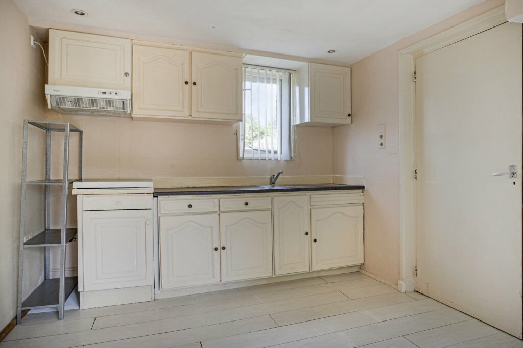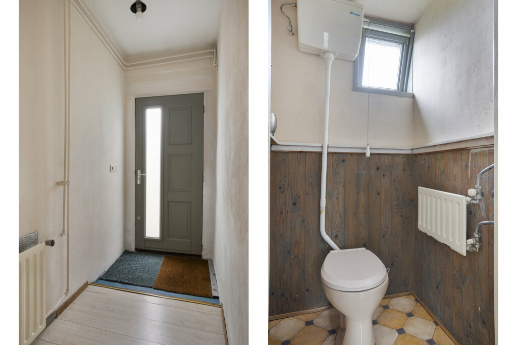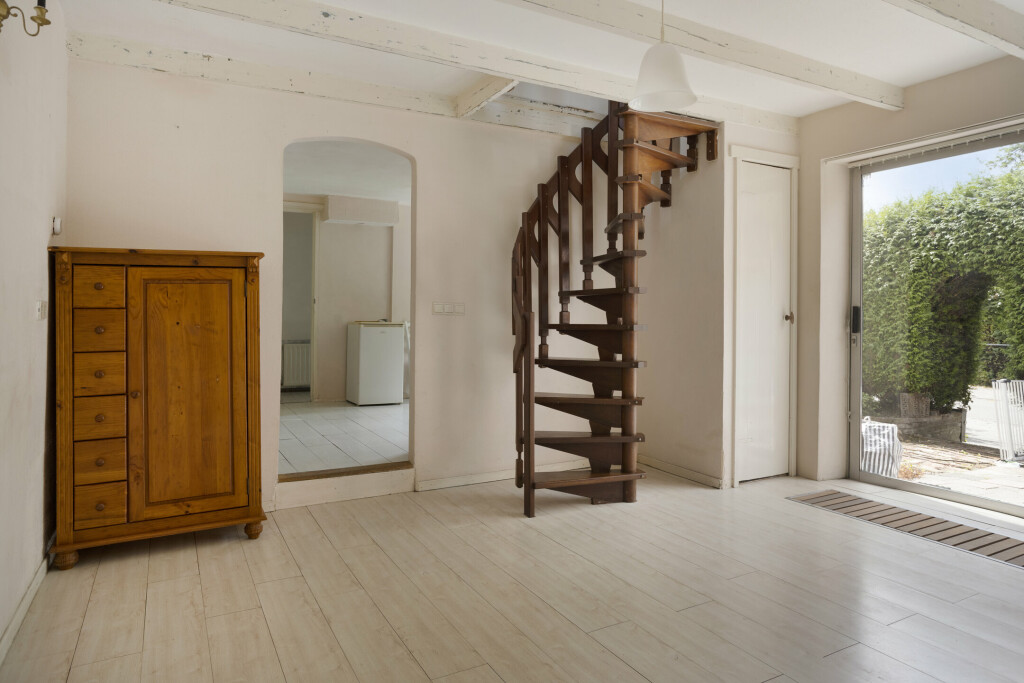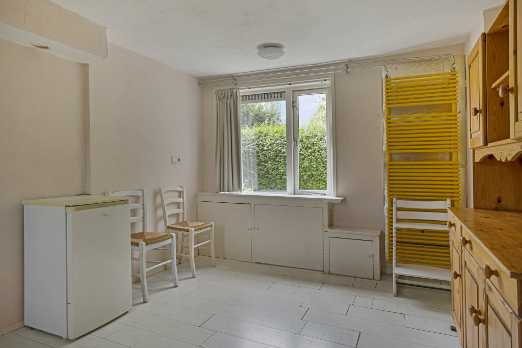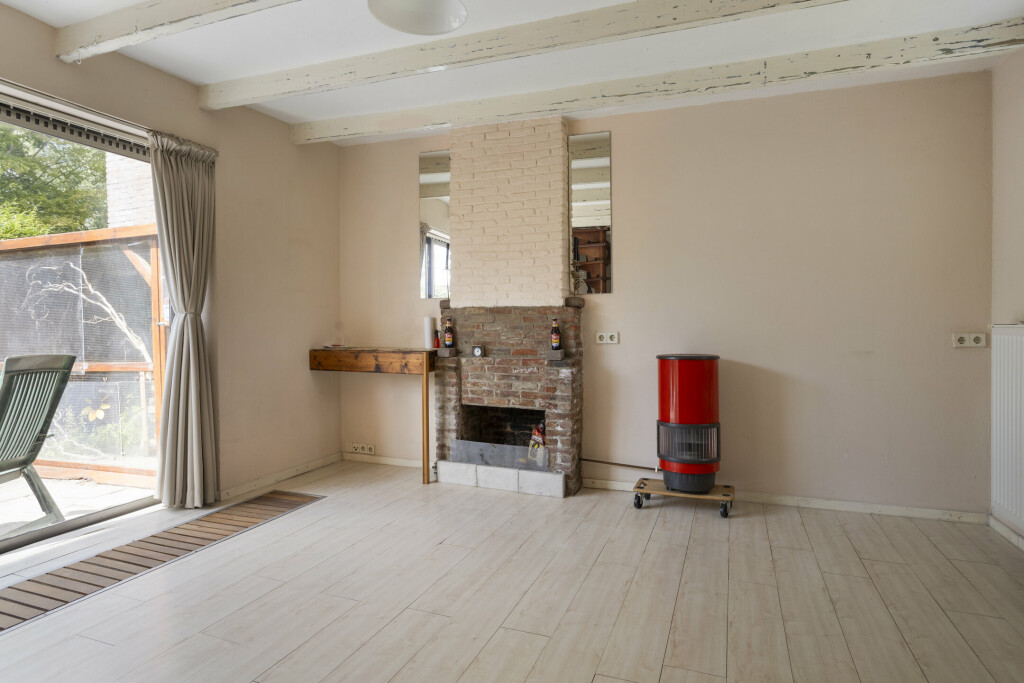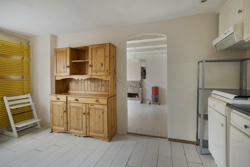 Via de gang met toilet kom je binnen in de ruime woonkeuken, het kloppend hart van het huis. Vanuit hier loop je door naar de lichte woonkamer met sfeervolle schouw. De dubbele schuifdeuren zorgen voor een prettige verbinding met buiten en laten veel daglicht binnenstromen. In de woonkamer vind je ook de houten wenteltrap naar de verdieping en de meterkast.